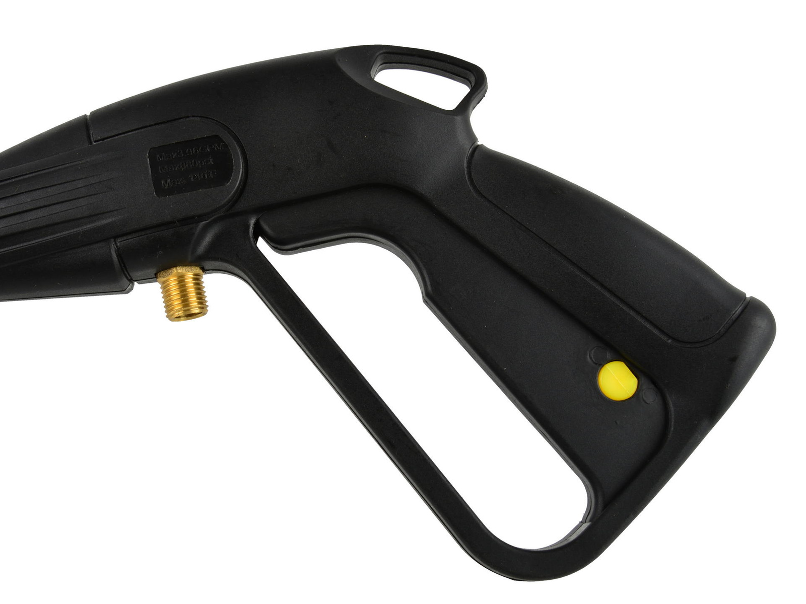 Pistolet z lancą do myjki wysokociśnieniowej z matalowym złączem, wyposażony w regulację szerokości strumienia. Dzięki zastosowaniu typowego gwintu (14 mm) pistolet pasuje praktycznie do wszystkich myjek ciśnieniowych dostępnych na polskim rynku.