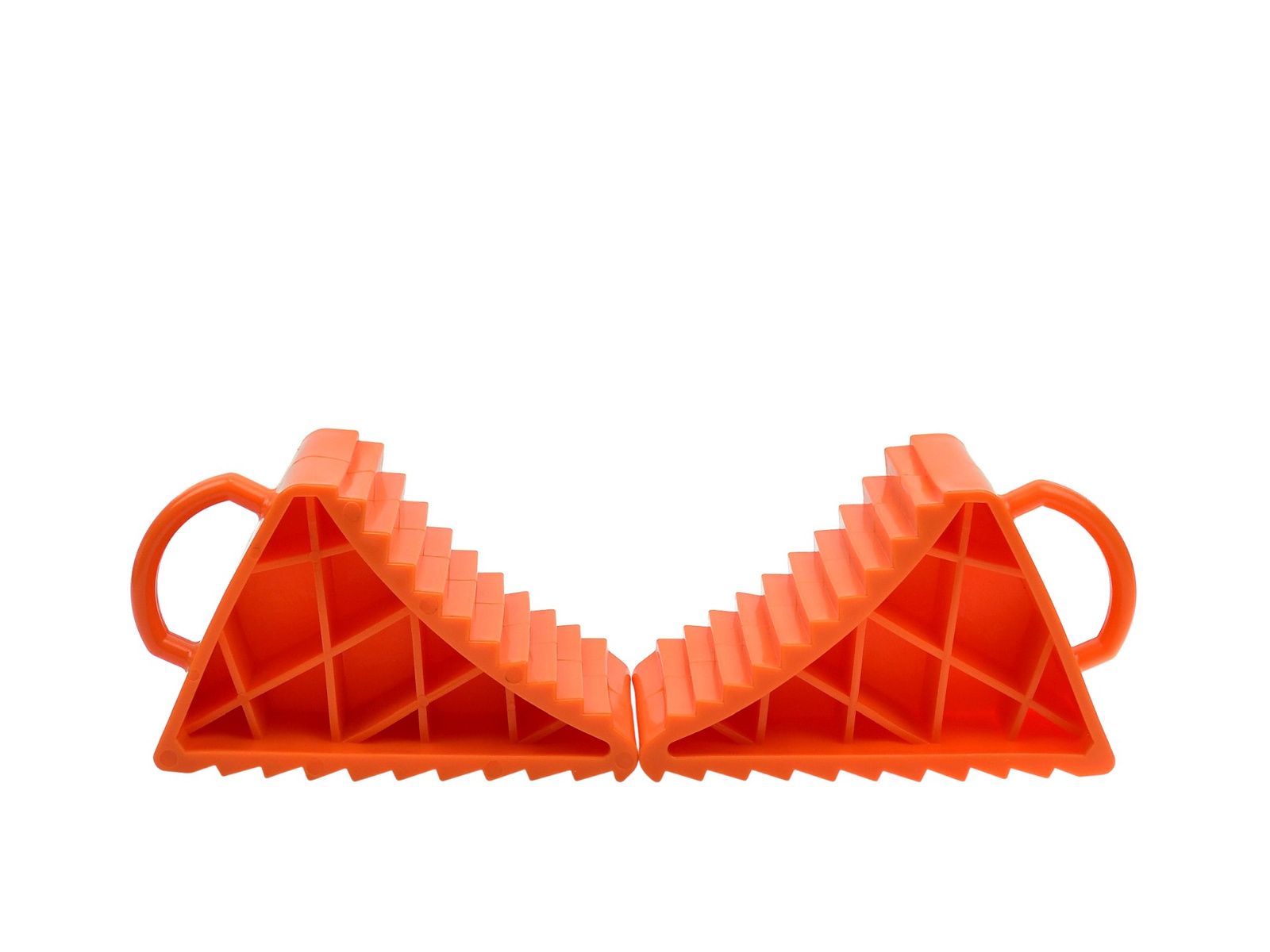 Zestaw wytrzymałych klinów po koła. Wykonane zostały z wysokiej jakości tworzywa sztucznego. Przeznaczone są do zabezpieczania różnego rodzaju pojazdów przed przypadkowym przemieszczeniem się. Antypoślizgowa żebrowana powierzchnia zapobiega przesuwaniu się klinów na podłożu o słabej przyczepności.