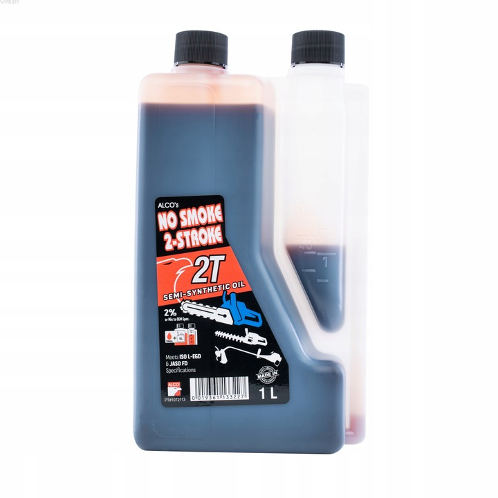 ALCO NO SMOKE TWO STROKE to półsyntetyczny, bezdymny olej do silników dwusuwowych. Przeznaczony do spalinowych pił łańcuchowych i kos, kosiarek, dmuchaw, motocykli oraz wszystkich innych dwusuwowych silników chłodzonych powietrzem. Został opracowany do mieszania z benzyną bezołowiową.