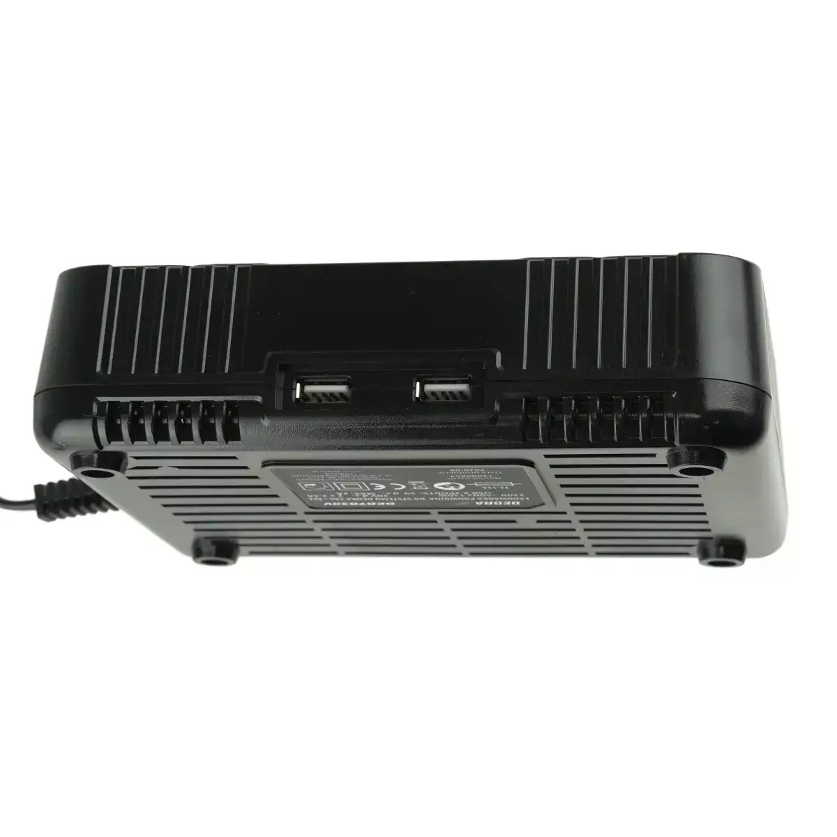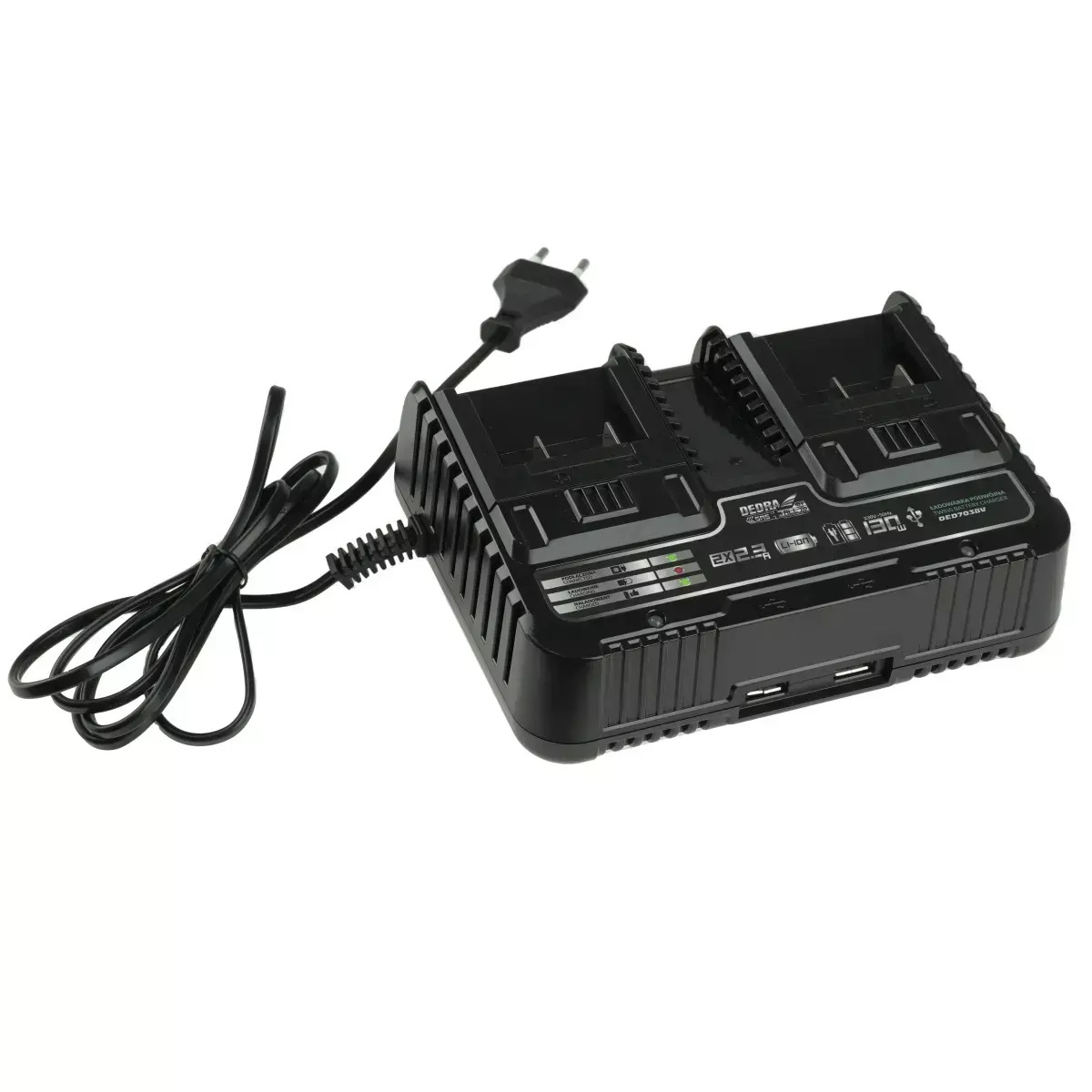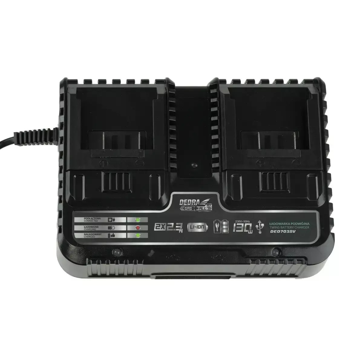 To produkt dedykowany do ładowania baterii z linii SAS+ALL (DED7032, DED7034, DED7035, DED6936, DED6937). Baterię 2.0Ah naładujemy w ciągu 1h, natomiast baterię 4.0Ah w 2h. Dzięki dwóm gniazdom ładowania możesz ładować swoje akumulatory jeszcze efektywniej. Ładowarka wyposażona trzy diody: jedna informująca o podłączeniu do sieci, druga o przebiegającym procesie ładowania, trzecia informująca o zakończonym procesie ładowania baterii. Dzięki dwóm gniazdom USB możesz doładować smartfona lub głośnik bluetooth.