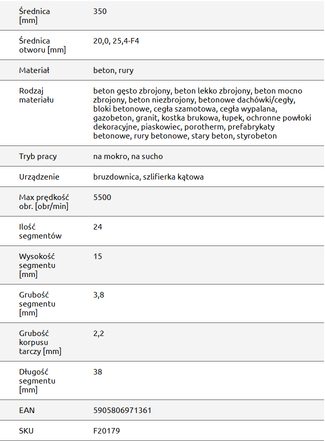 - Segment turbo bardzo sprawnie penetruje materiały takie jak beton, beton zbrojony.