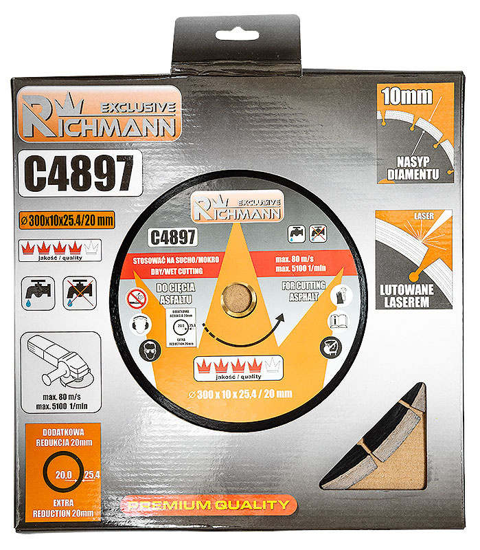 Średnica tarczy wynosi: 300 mm, grubość: 3,20 mm, otwór: 20/25,4 mm, powierzchnia diamentowa: 10 mm.