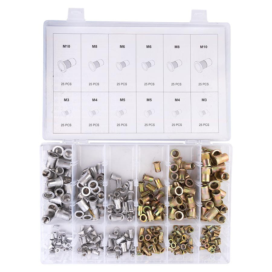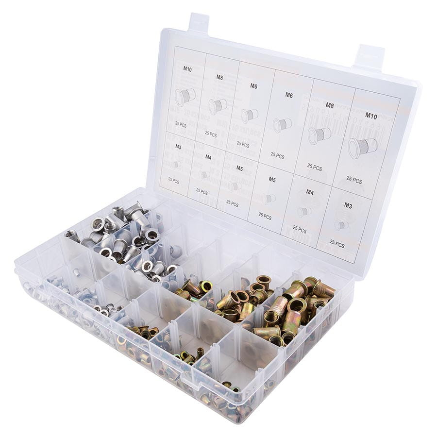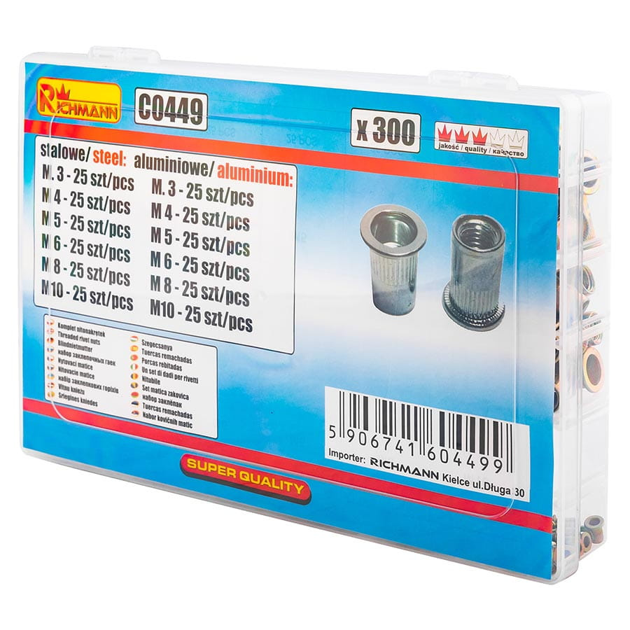 Zestaw 300 sztuk nitonakrętek w rozmiarach M3 - M10 Richmann C0449. Mieszany komplet 300 sztuk nitonakrętek stalowych i aluminiowych w różnych rozmiarach M3-M10. Umożliwiają przymocowanie wkrętu lub śruby z gwintem metrycznym w blachę lub w inne podobne materiały. Posiadają kołnierz walcowy, radełkowany, który powoduje lepsze przyleganie do materiału. Opakowanie wyposażone w przegrody na każdy rozmiar. Wszystkie przegrody mają opisany rozmiar na wewnętrznej części klapy.