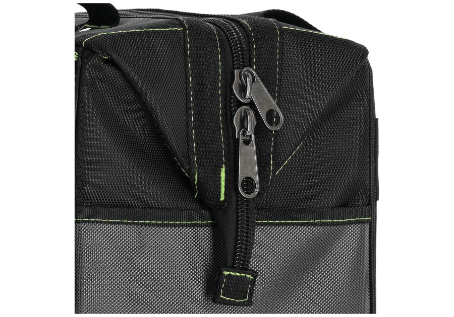 Średniej wielkości torba narzędziowa "TNP10M" jest produktem przydatnym przy pracach w terenie. Znajdzie zastosowanie w pracy serwisantów, mechaników i monterów. Służy do transportu i przechowywania narzędzi, a jej konstrukcja ułatwia utrzymanie porządku nawet wśród bardzo drobnych akcesoriów. Torba jest wyposażona w 11 kieszeni zewnętrznych, z czego największa jest zapinana. W głównej komorze znajduje się dodatkowo 6 kieszonek na drobne przedmioty. Sztywna konstrukcja zapobiega rozsypywaniu zawartości i chroni zgromadzone przedmioty. Komora zamykana jest za pomocą trwałego suwaka przyszytego podwójnym wzmocnionym ściegiem. Do przenoszenia torby służy uchwyt w górnej części, a jego mocowanie zostało zabezpieczone za pomocą nitów. Trwałość produktu zapewnia wysokiej jakości tkanina poliestrowa, wykorzystana do wyszycia całości. Jest odporna na przetarcia i przebicie, nie chłonie wilgoci, a ponadto można łatwo ją prać i czyścić