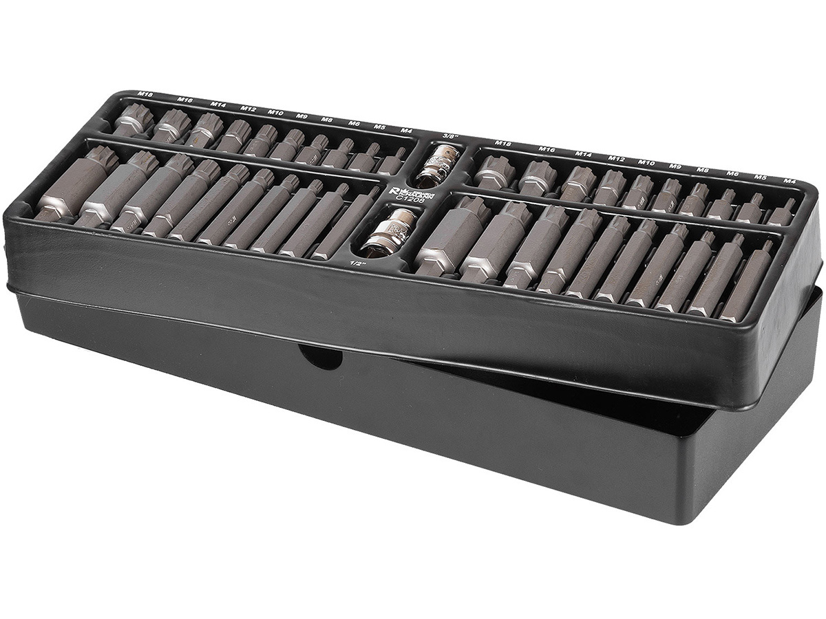 W zestawie znajdują się bity typu SPLINE i RIBE, uchwyt 1/2" oraz uchwyt 3/8".