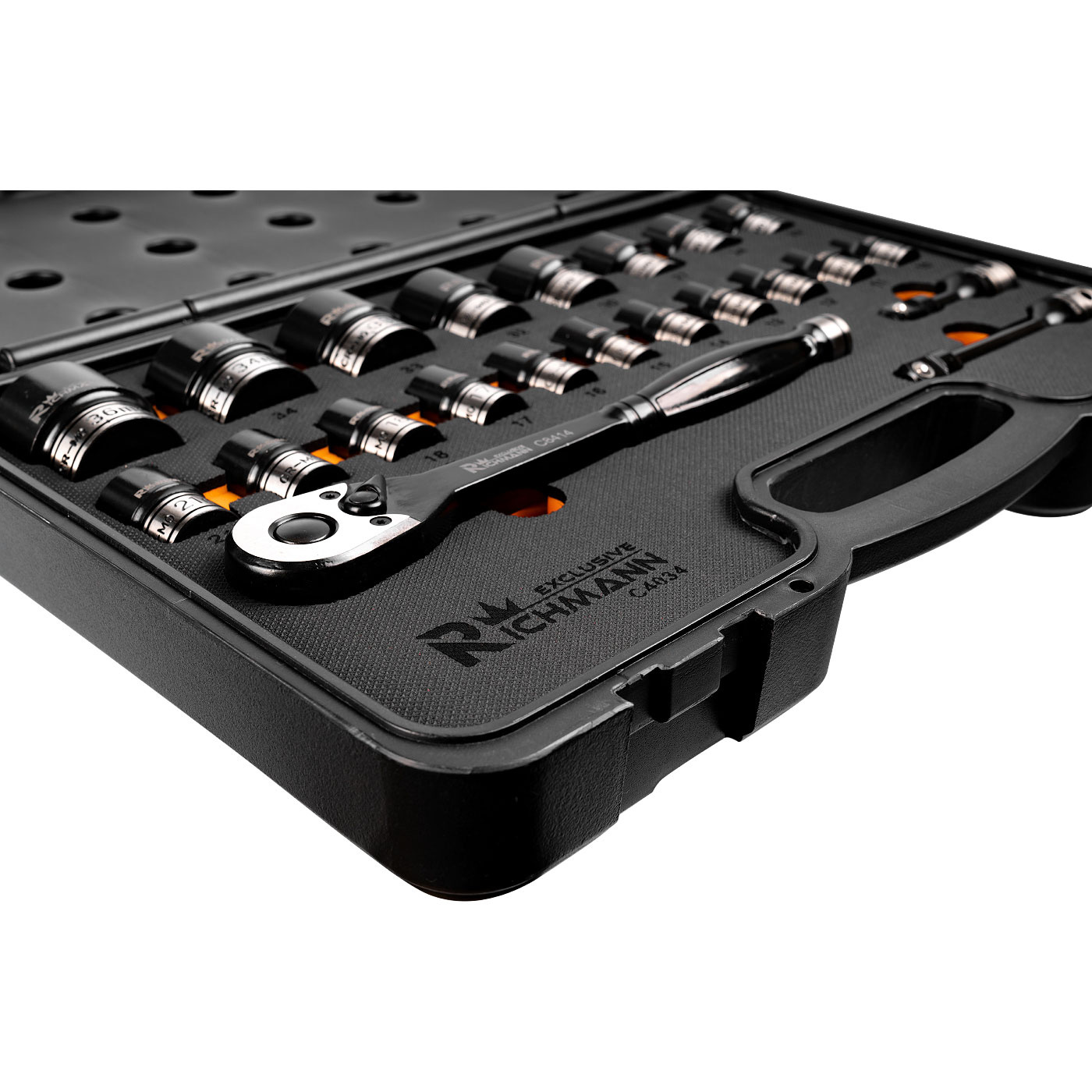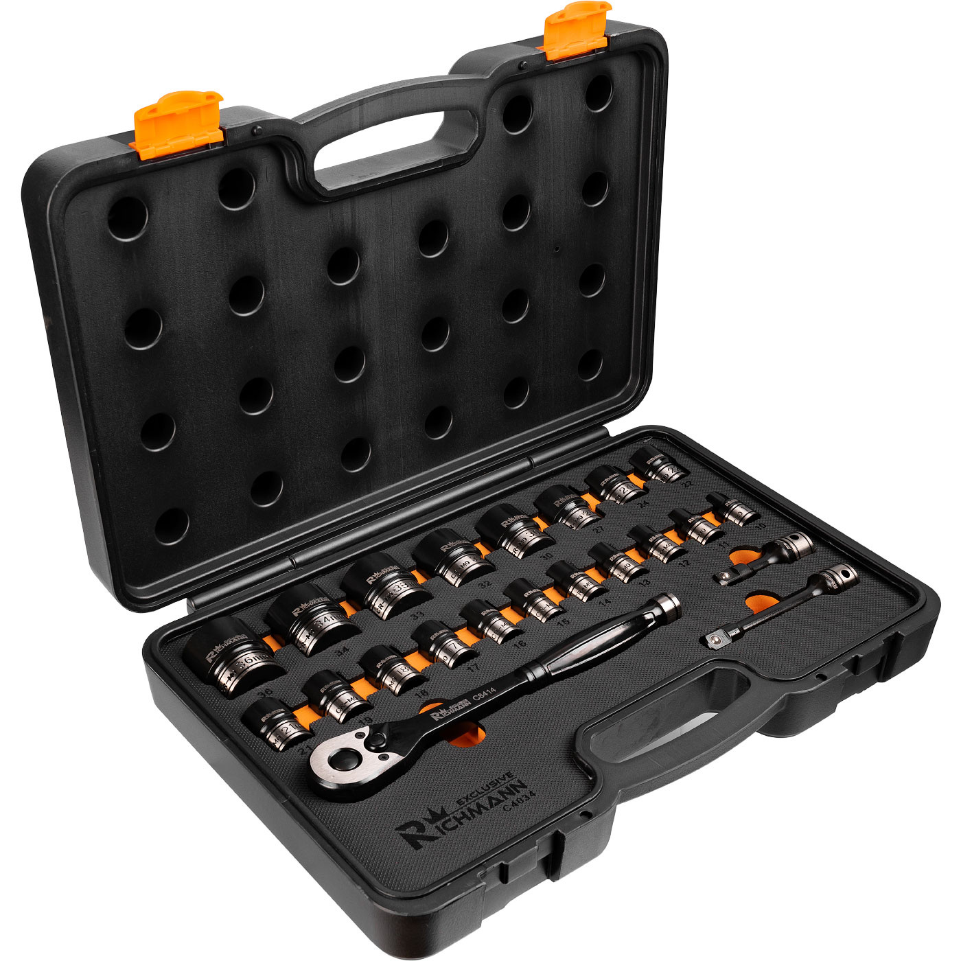 Zestaw 22 sztuk nasadek udarowych sześciokątnych z uchwytem ½” umieszczonych w kompozytowej walizce transportowej.