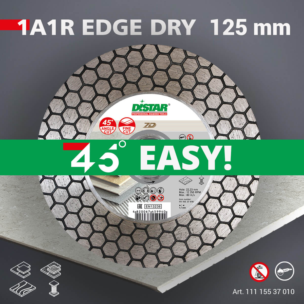 Tarcza diamentowa 1A1R 125 EDGE DRY przeznaczona jest do precyzyjnego cięcia i fazowania płytek ceramicznych pod kątem 45°. Wyposażona w szeroką, dwustronną warstwę diamentową o wysokości 25 mm, która wzmacnia korpus i zapewnia wysoką stabilność podczas pracy.
