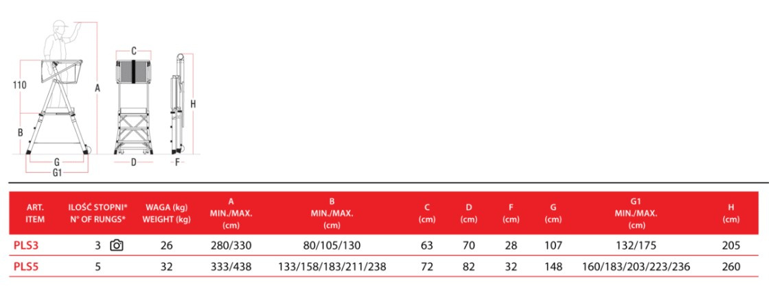 • PLS to podest teleskopowy z regulacją wysokości platformy.
