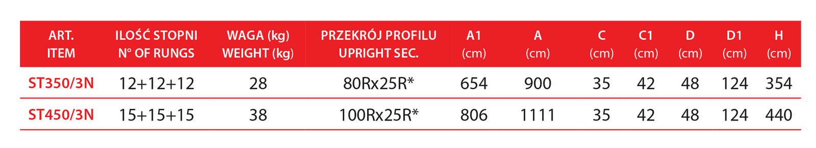 - Szczeble 3 x 3 cm, opcjonalnie 8 cm (kod GR80),