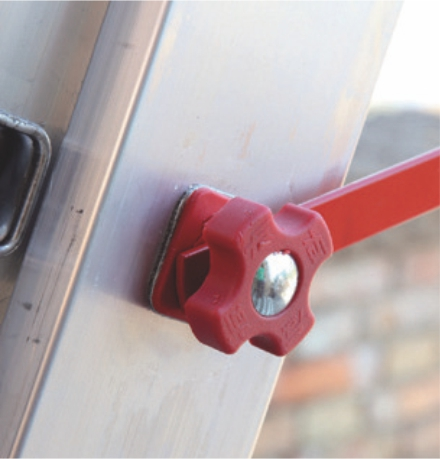 Drabina posiada odpowiednio trwały stabilizator ze stopkami z antypoślizgowego tworzywa zapewniający stabilne oparcie drabiny w czasie pracy.