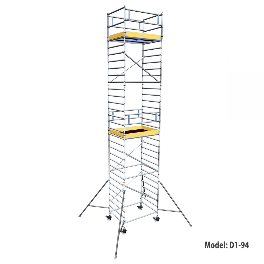 - Wieża jest wyposażona w koła o wysokiej wytrzymałości, z osiowym hamulcem o średnicy 200 mm i systemem poziomowania.