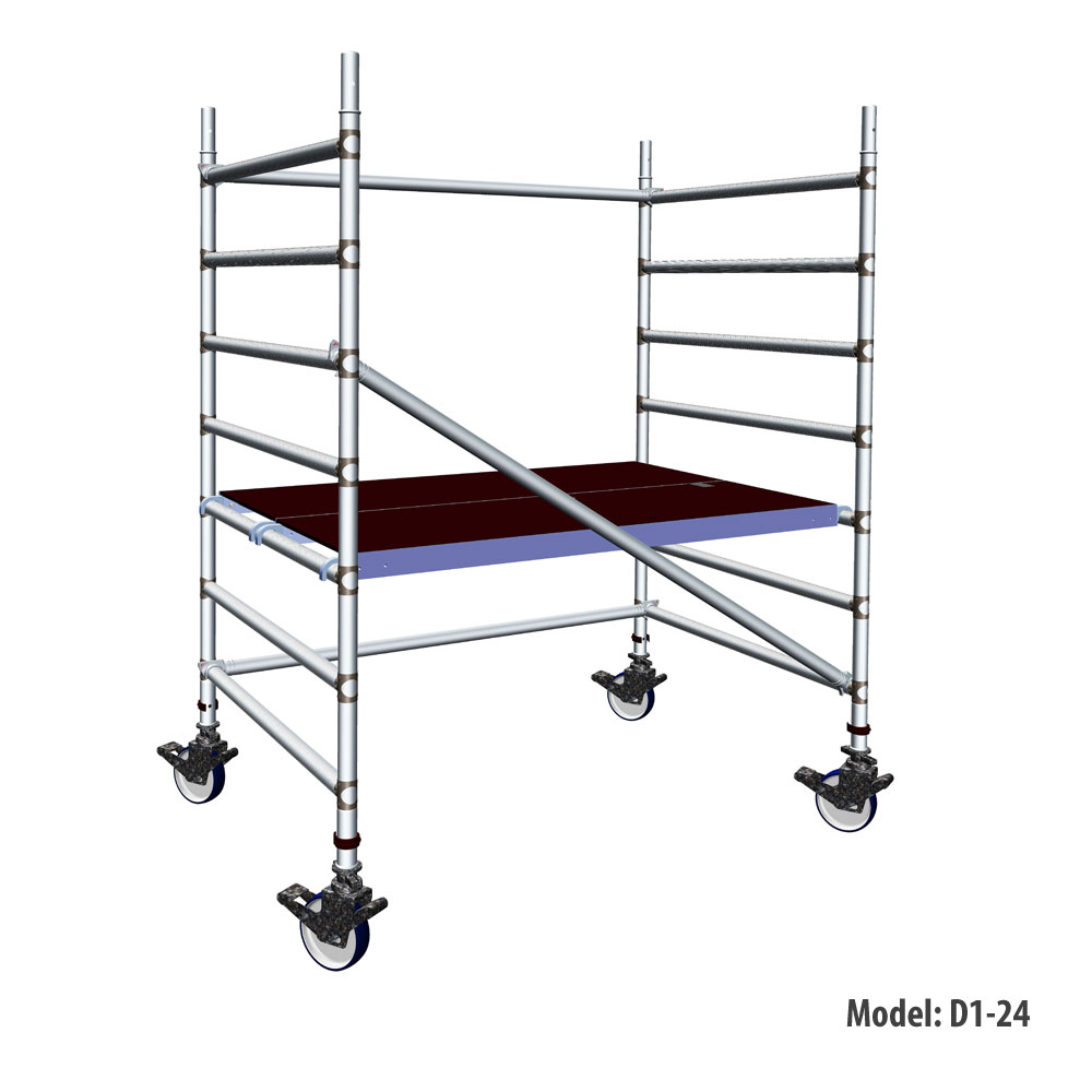 - Wieża jest wyposażona w koła o wysokiej wytrzymałości, z osiowym hamulcem o średnicy 200 mm i systemem poziomowania.