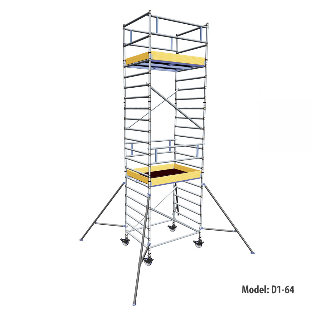 - Wieża jest wyposażona w koła o wysokiej wytrzymałości, z osiowym hamulcem o średnicy 200 mm i systemem poziomowania.