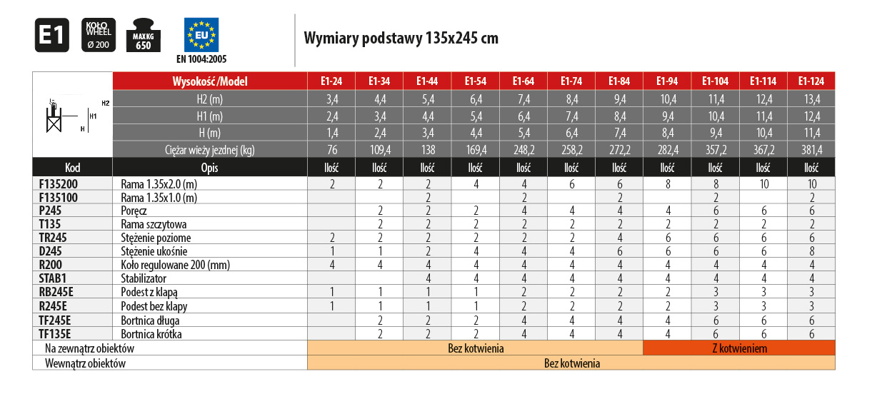 - Pojedyncze wieże jezdne o szerokości 135 cm i długości 245 cm.