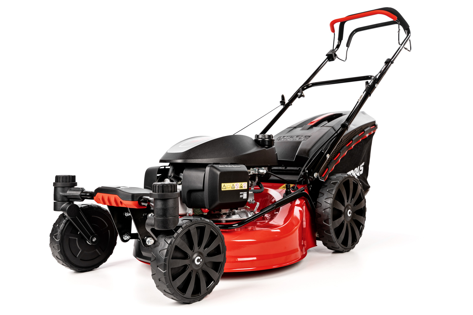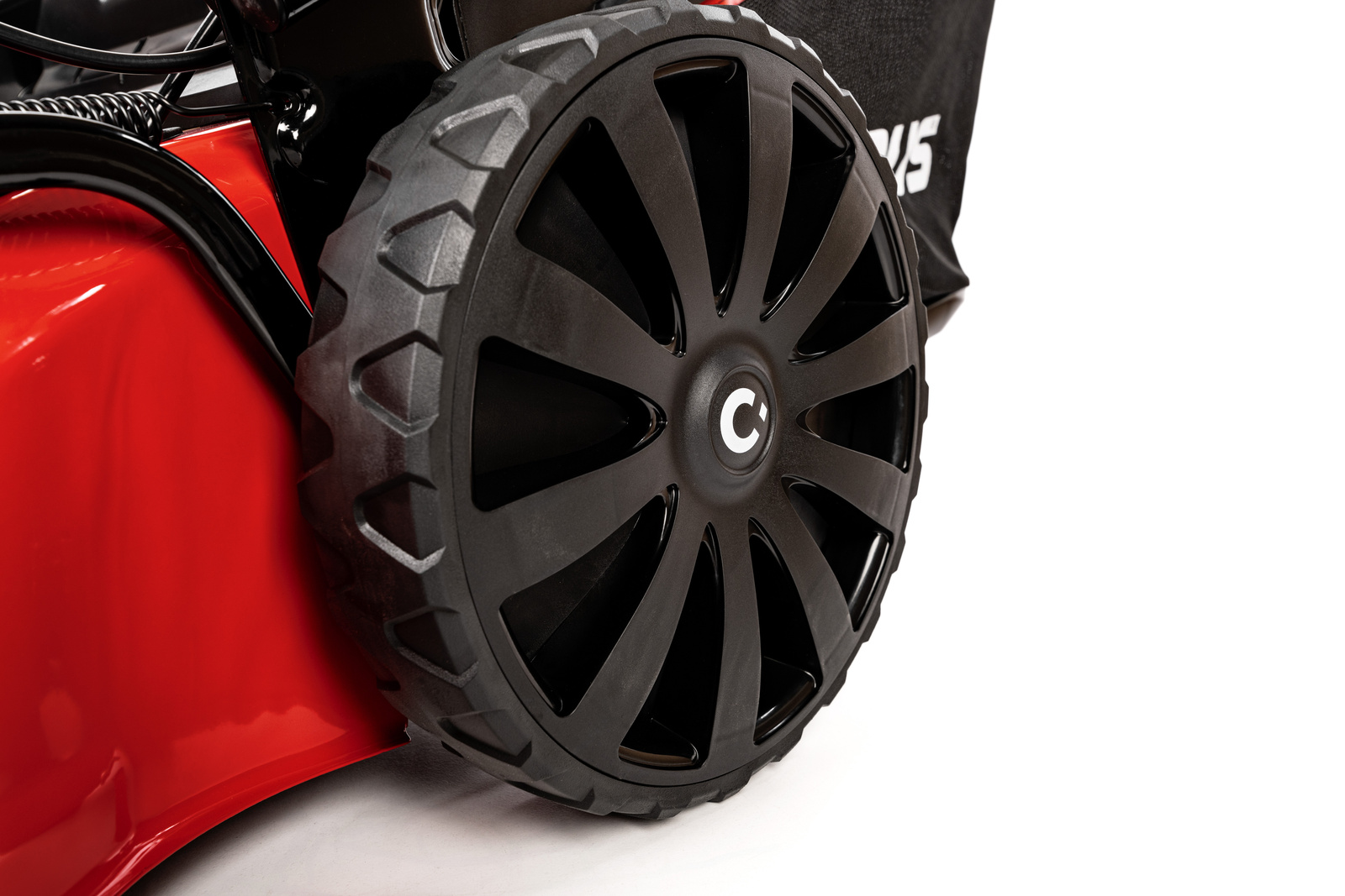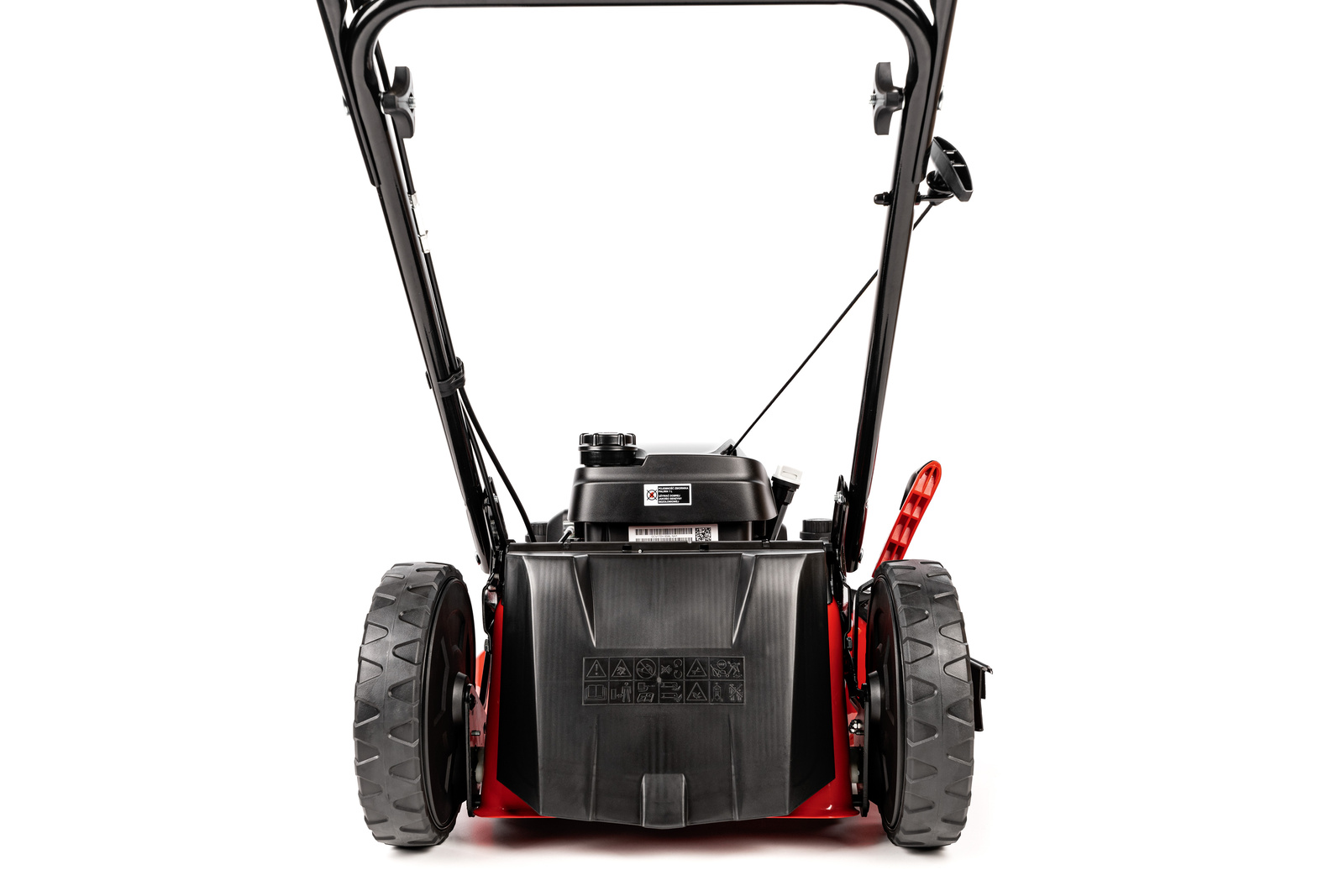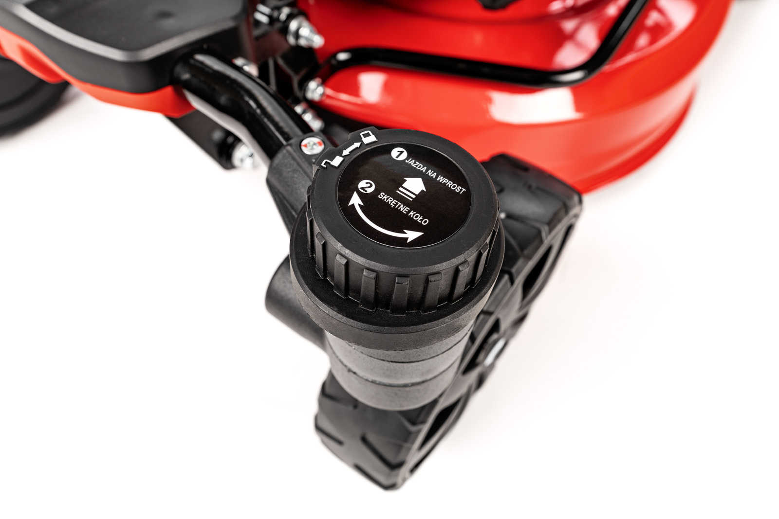 Napęd na koła: System napędu redukuje wysiłek operatora, umożliwiając łatwe prowadzenie kosiarki, szczególnie na nierównym terenie.