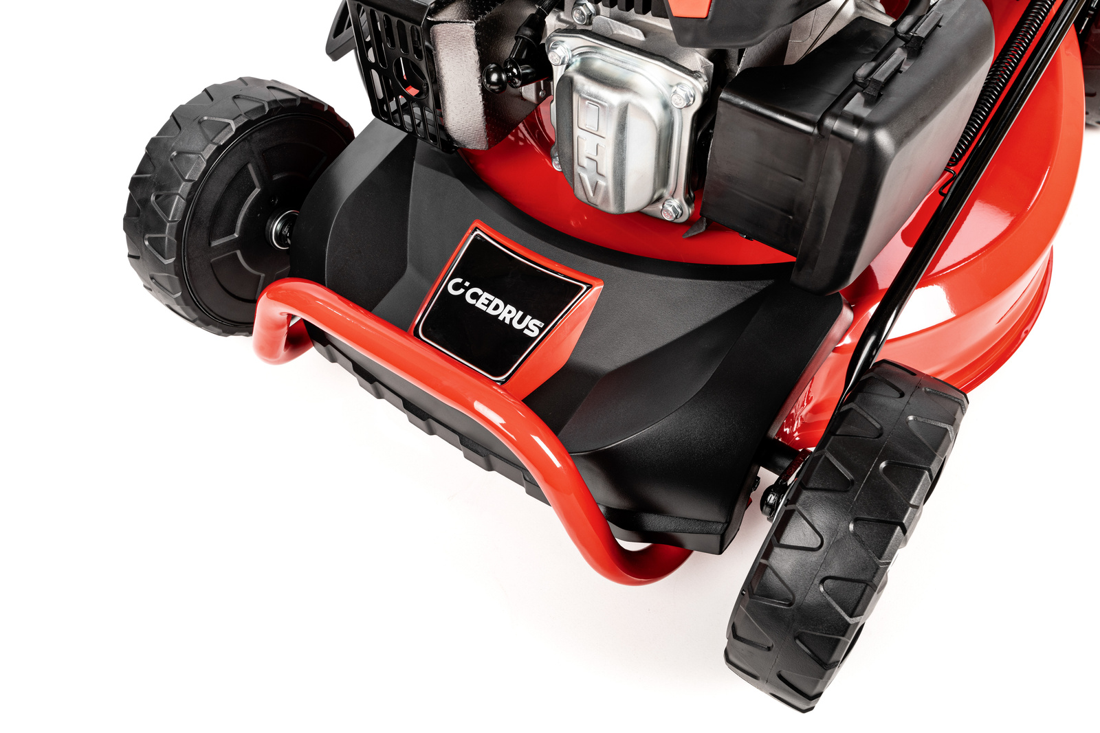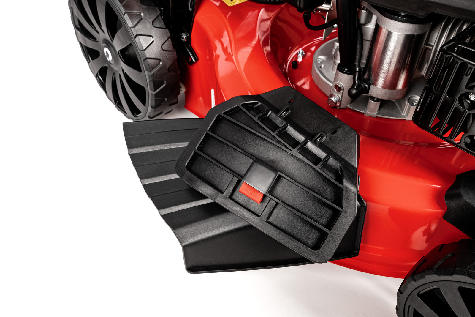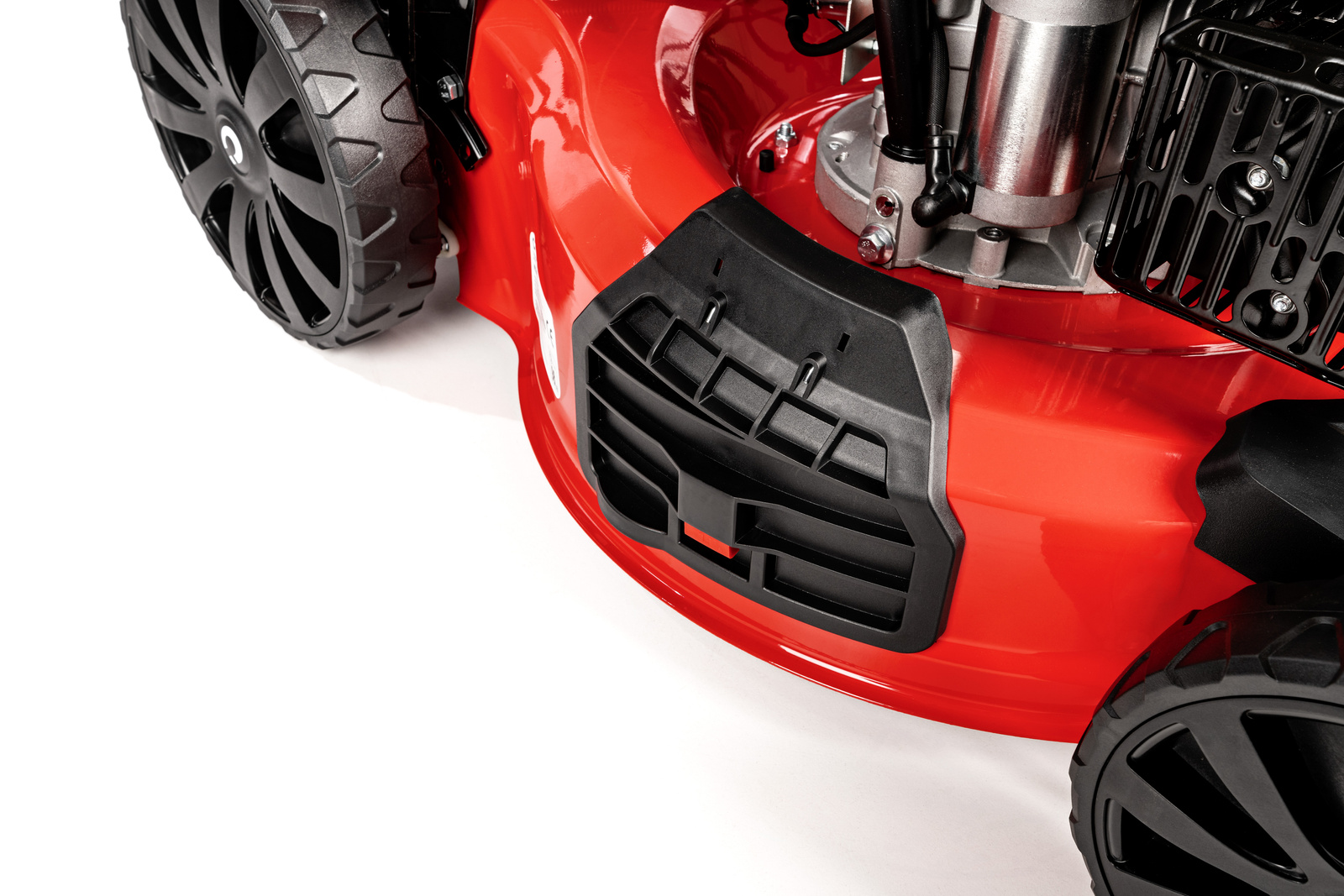 • Stalowa obudowa gwarantuje trwałość i odporność na uszkodzenia, a duże, łożyskowane koła (z tyłu większe, z przodu mniejsze) zapewniają łatwość manewrowania. Uchwyt wyposażono w dźwignię gazu, dźwignię ssania oraz miejsce na kubek, co zwiększa komfort użytkowania. Dodatkowym atutem jest złącze do mycia podwozia, ułatwiające utrzymanie kosiarki w czystości po pracy.