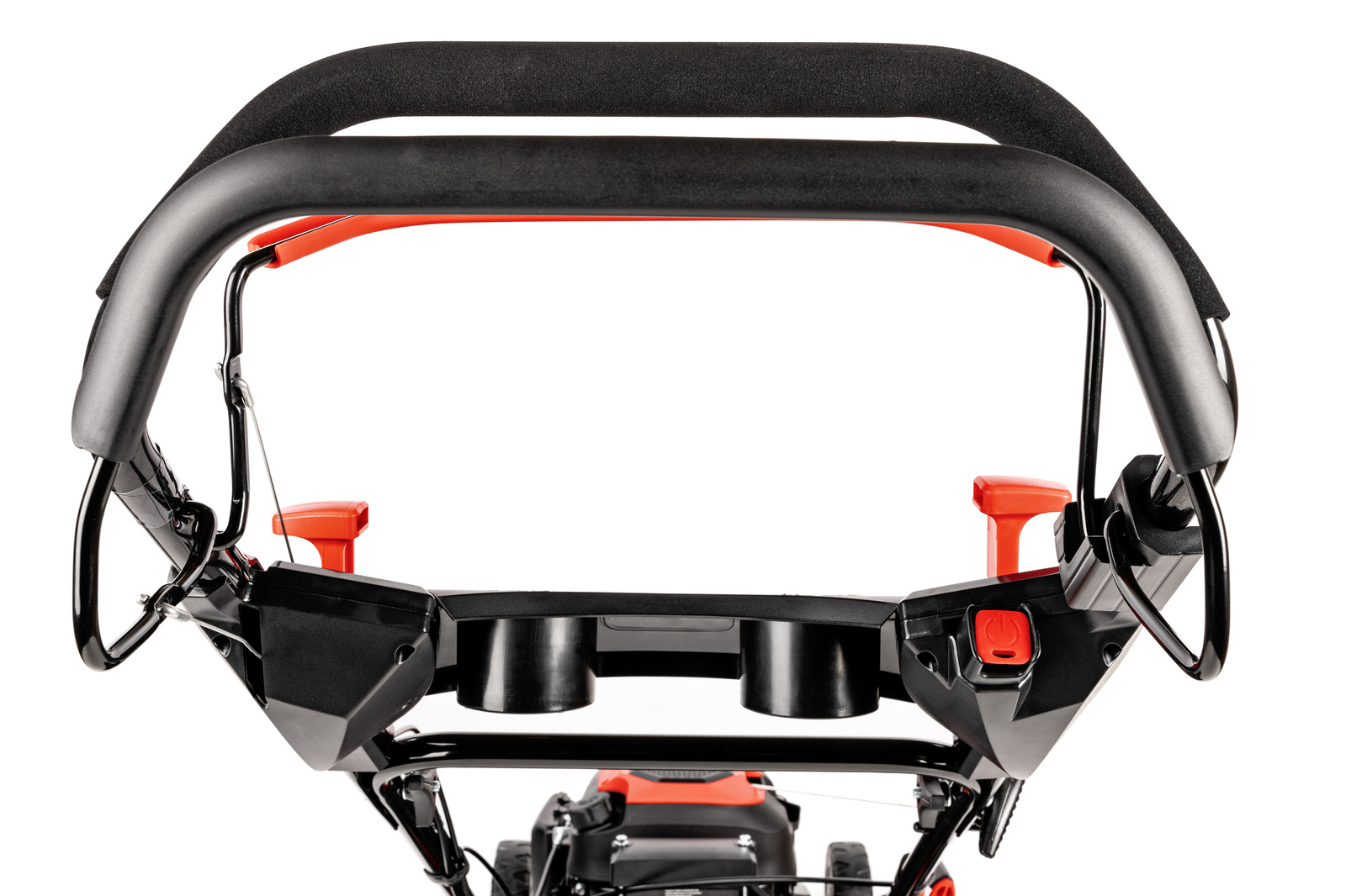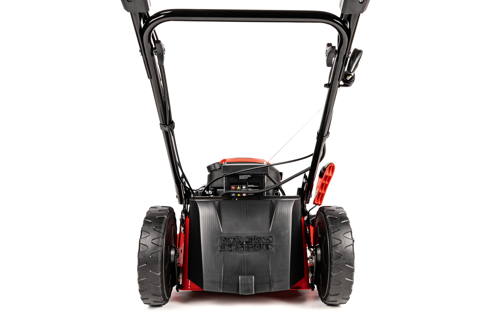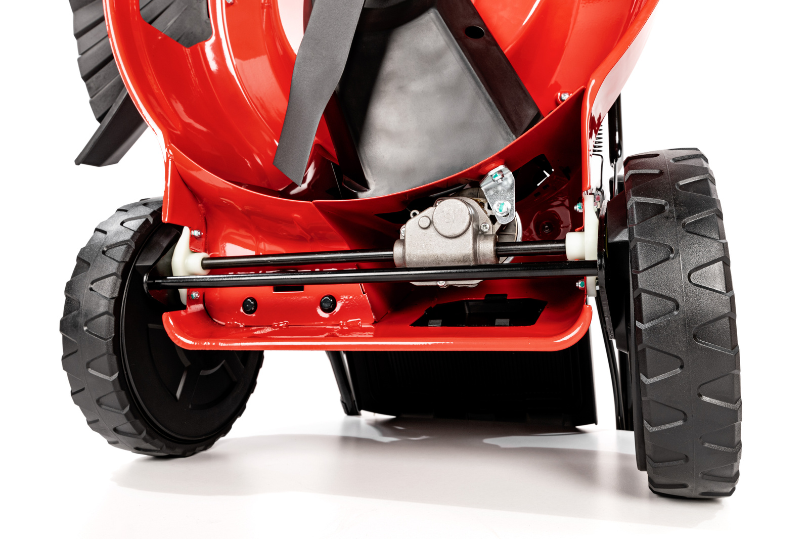 • Stalowa obudowa gwarantuje trwałość i odporność na uszkodzenia, a duże, łożyskowane koła (z tyłu większe, z przodu mniejsze) zapewniają łatwość manewrowania. Uchwyt wyposażono w dźwignię gazu, dźwignię ssania oraz miejsce na kubek, co zwiększa komfort użytkowania. Dodatkowym atutem jest złącze do mycia podwozia, ułatwiające utrzymanie kosiarki w czystości po pracy.