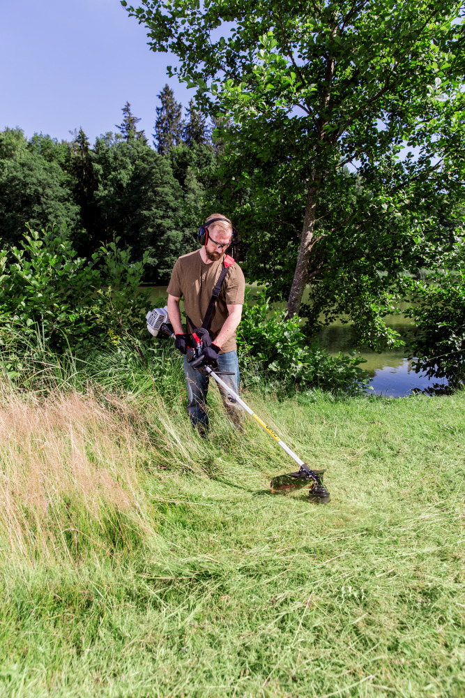 Niska waga, regulowana kierownica typu i wygodna funkcja regulacji żyłki - automatyka impulsowa - dla zawsze optymalnej długości żyłki. Wszystkie te cechy zapewniają, że kosa jest bardzo bezpieczna i łatwa w użyciu. Ponadto dzięki pasowi nośnemu praca jest wygodna i ergonomiczna.