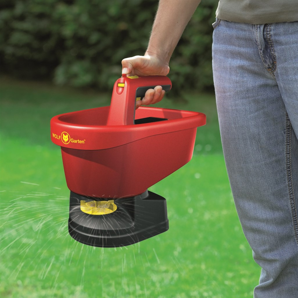 Lekki i poręczny rozsiewacz uniwersalny na baterię WOLF-Garten WE-B pozwala na szybkie i wygodne rozrzucanie nasion, nawozu a nawet piasku i soli na powierzchni do 750 m². Wykonany z bardzo wytrzymałego i odpornego na działanie rozrzucanych preparatów. Pojemność prezentowanego siewnika to 3 l, a zasięg rozrzutu można regulować za pomocą wygodnych pokręteł w zakresie od 0,5 do 2,5 m. Rozsiewacz ręczny zasilany jest czterema bateriami AA (paluszki) które nie znajdują się w zestawie. Jego budowa pozwala na wygodną pracę prawą jak i lewą ręka.