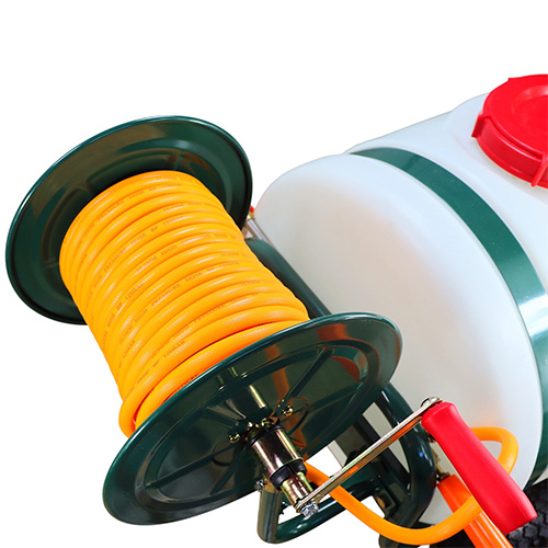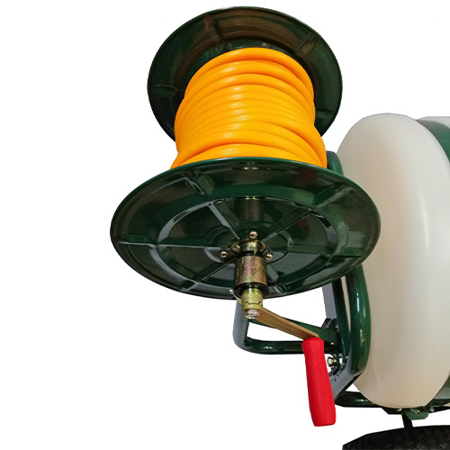 Opryskiwacz jest wyposażony w 25 metrowy wąż oraz lancę z regulacją strumienia cieczy.