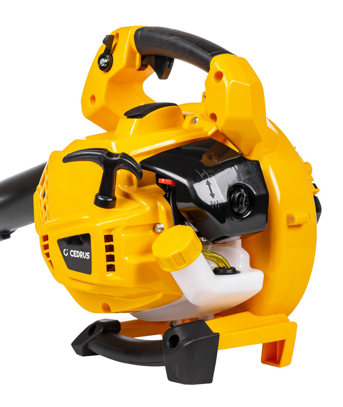 Dmuchawę Cedrus DM03 2W1 bardzo łatwo uruchomić, a dodatkową zaletą jest blokada obrotów silnika, dzięki czemu operator nie musi cały czas naciskać na dźwignię gazu podczas pracy.