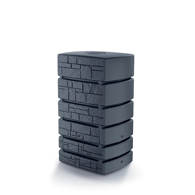 Zbiornik Tower Stone to designerski i funkcjonalny zasobnik na wodę deszczową, którego posegmentowana bryła o strukturze inspirowanej skałą łupkową ma atrakcyjny wygląd, który wkomponowuje się w estetykę ogrodu, łącząc się z detalami ogrodowymi i architektonicznymi.