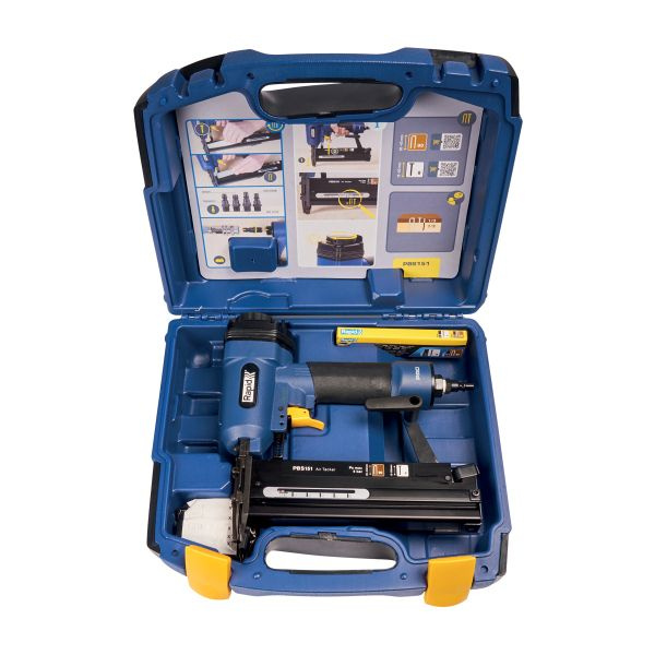 Doskonale wyważona, profesjonalna sztyfciarka pneumatyczna/zszywacz z obudową ze stopu magnezu usprawnia i ułatwia pracę. Podwójny magazynek umożliwia maksymalną wydajność dzięki obsłudze sztyftów nr 8 (do 50 mm) i zszywek nr 90 (do 40 mm). Model PBS151 należy do rodziny produktów Airtac™ i jest przeznaczony do pracy podczas wykonywania mebli, boazerii, szaf, wykończeń i listw ozdobnych. Wygodny uchwyt i mechanizm regulacji głębokości umożliwiają uzyskanie optymalnej precyzji. Inne kluczowe funkcje, które są pomocne w codziennej pracy to: system szybkiego załadunku, regulowany wyrzut powietrza i nakładka zabezpieczająca. Sztyfciarka jest dostarczana w solidnej walizce z niezbędnym wyposażeniem. Narzędzie jest objęte 2-letnią gwarancją.
