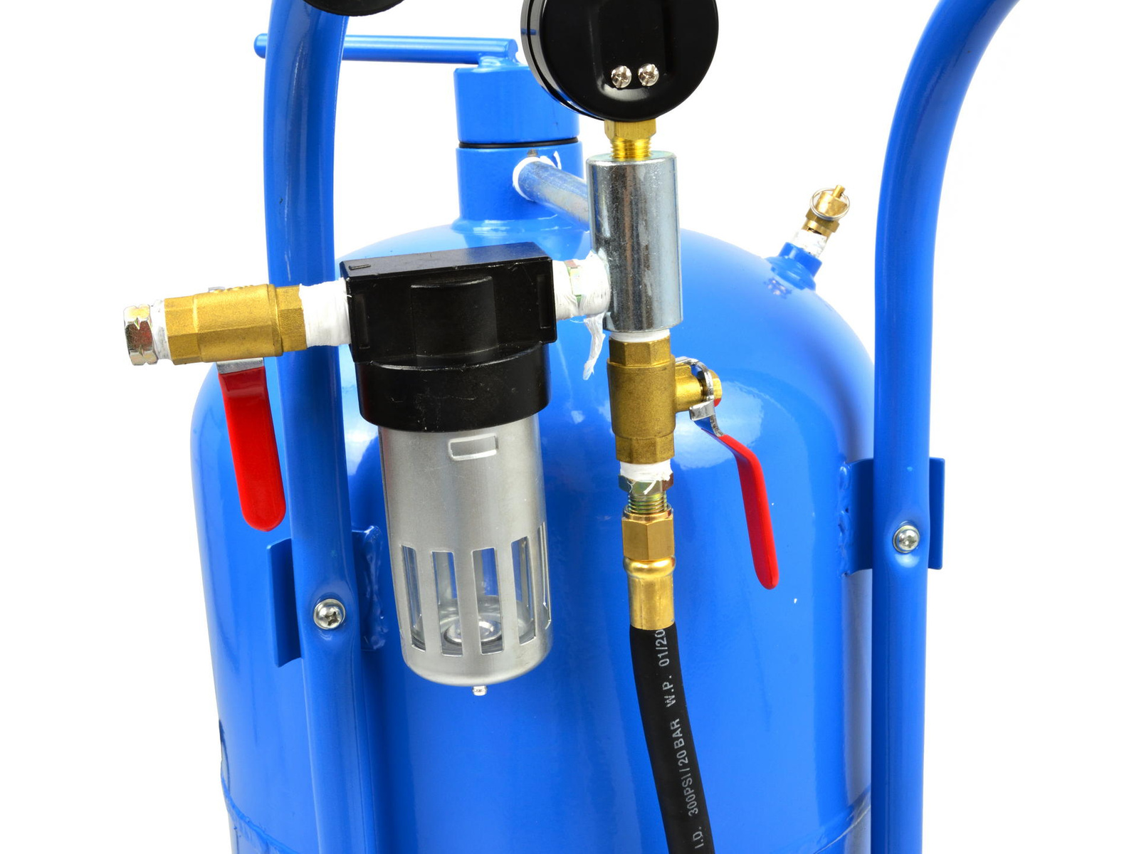 Mobilna piaskarka ciśnieniowa (syfonowa) o pojemności 38 litrów. Idealnie nadaje się do renowacji, konserwacji, pracy w serwisach blacharskich, mechanicznych, oraz zakładach produkcyjnych. Wyposażona w dysze i pistolet do piaskowania, zawór odcinający, manometr, wąż do piaskowania, lejek do napełniania zbiornika oraz maskę ochronną z szybką z pleksi.