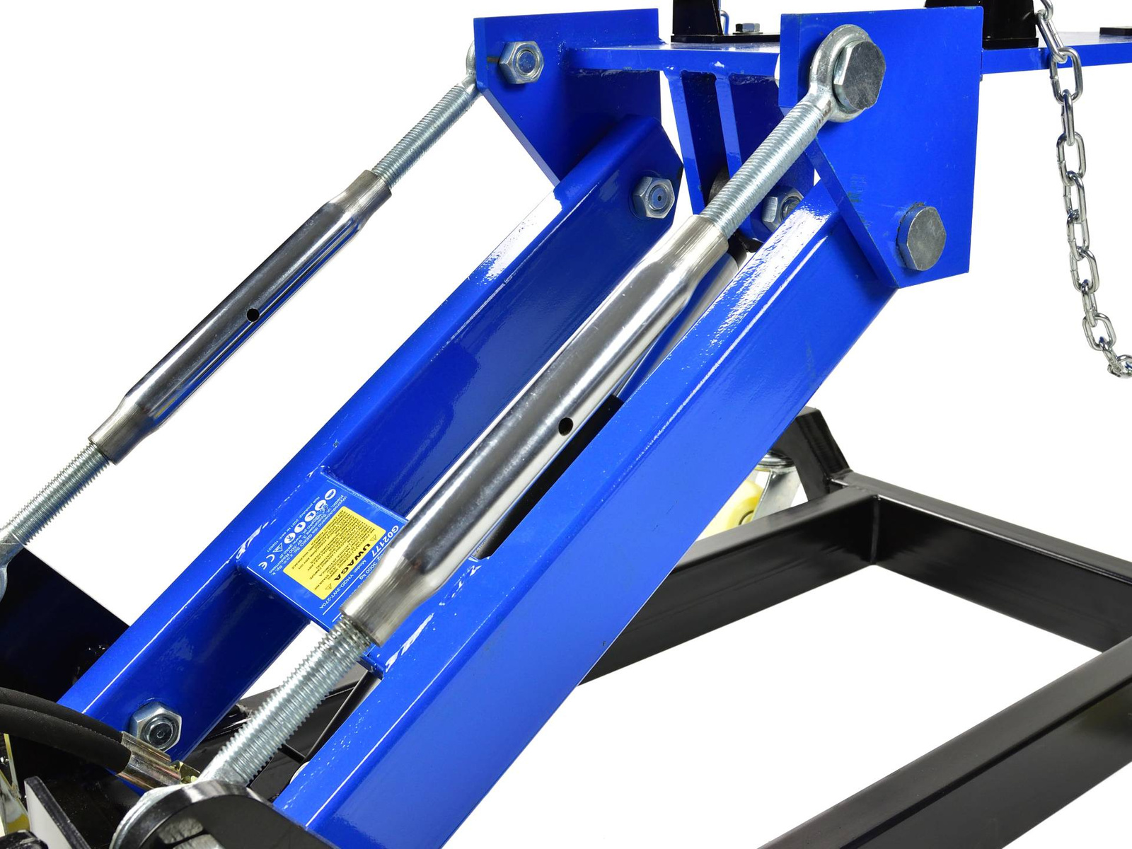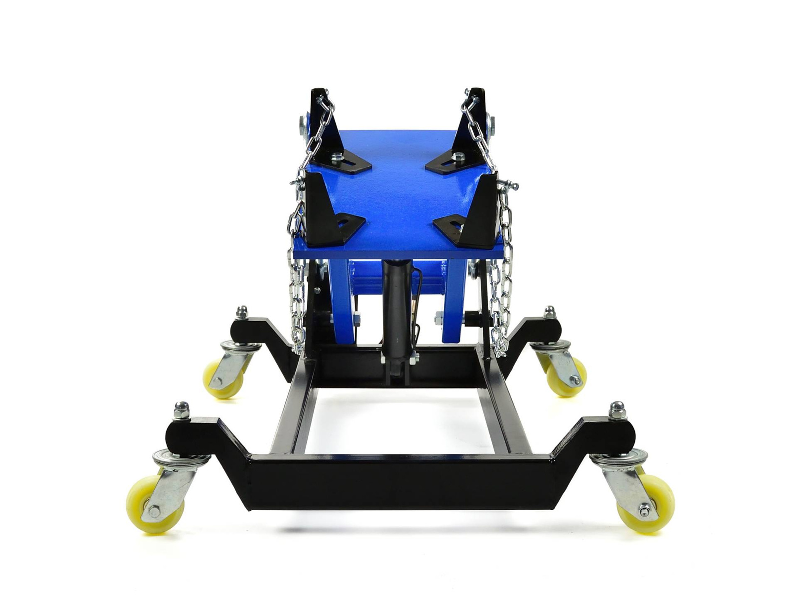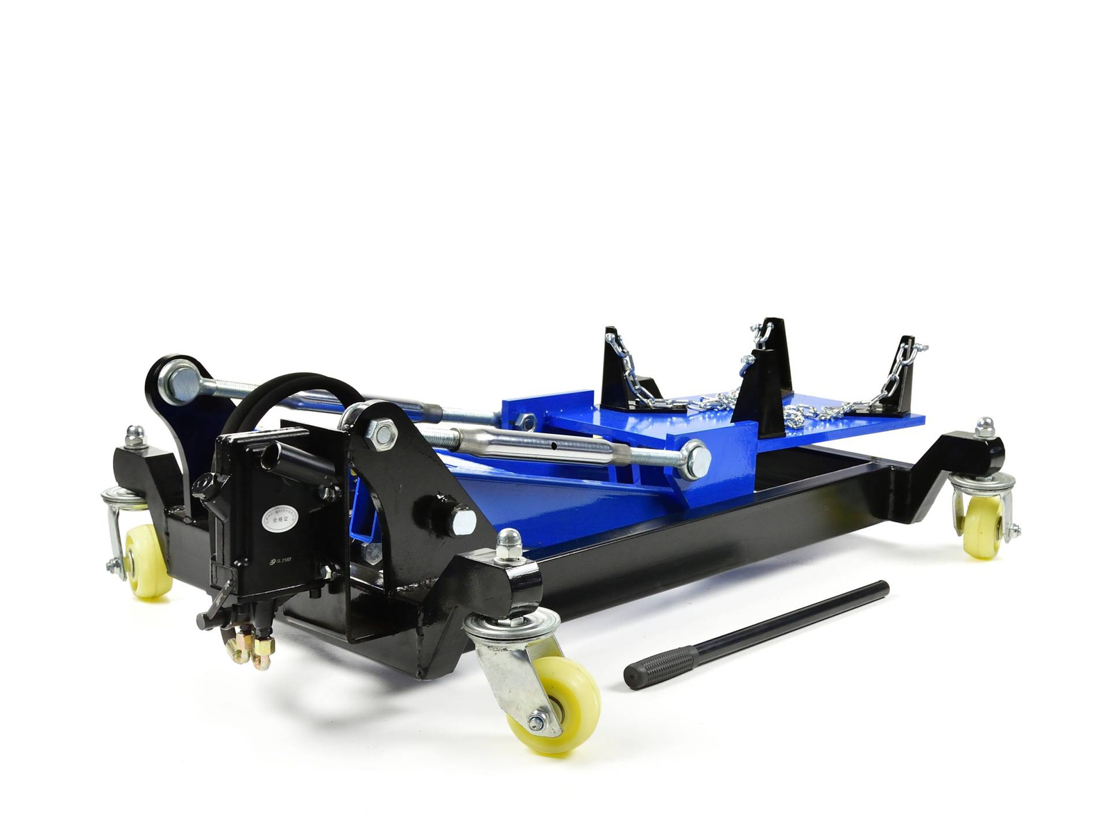 Hydrauliczny podnośnik podłogowy przeznaczony do wspomagania montażu oraz demontażu skrzyni biegów, przekładni różnicowych itp. Solidna stalowa konstrukcja w połączeniu z szybkim podnośnikiem hydraulicznym o udźwigu do 3 ton sprosta oczekiwaniom nawet najbardziej wymagających użytkowników. Posiada dwie śruby rzymskie przeznaczone do regulacji kąta nachylenia podstawy montażowej. Łatwe manewrowanie podnośnikiem umożliwia zestaw czterech łożyskowanych kół skrętnych wykonanych z poliamidu . W zestawie nie zabrakło również czterech niezależnie regulowanych uchwytów oraz dwóch łańcuchów przeznaczonych do mocowania demontowanego elementu.