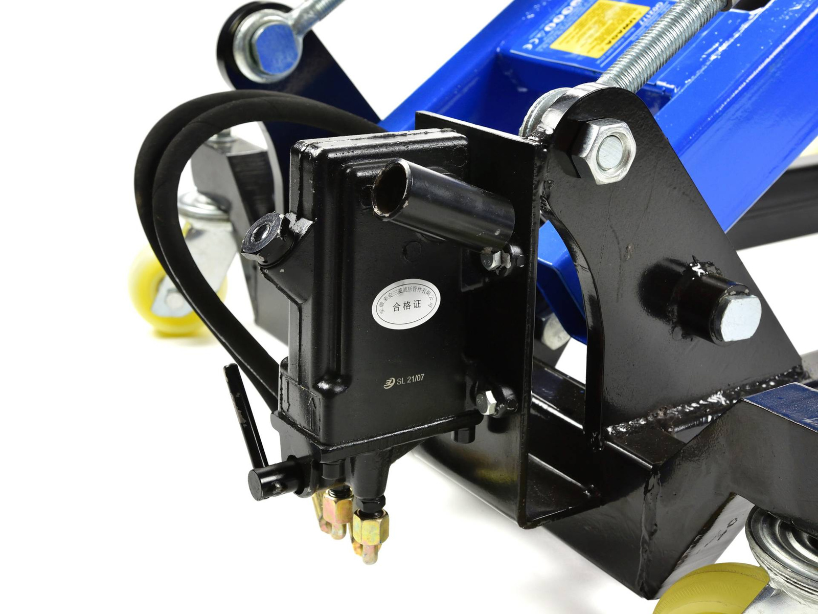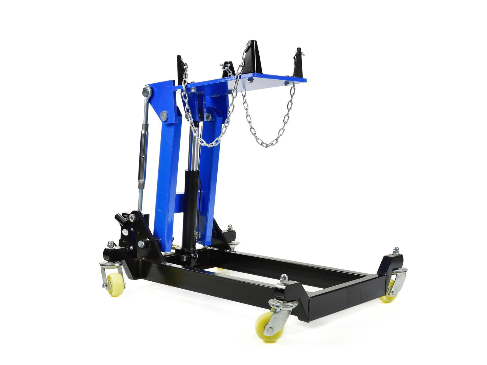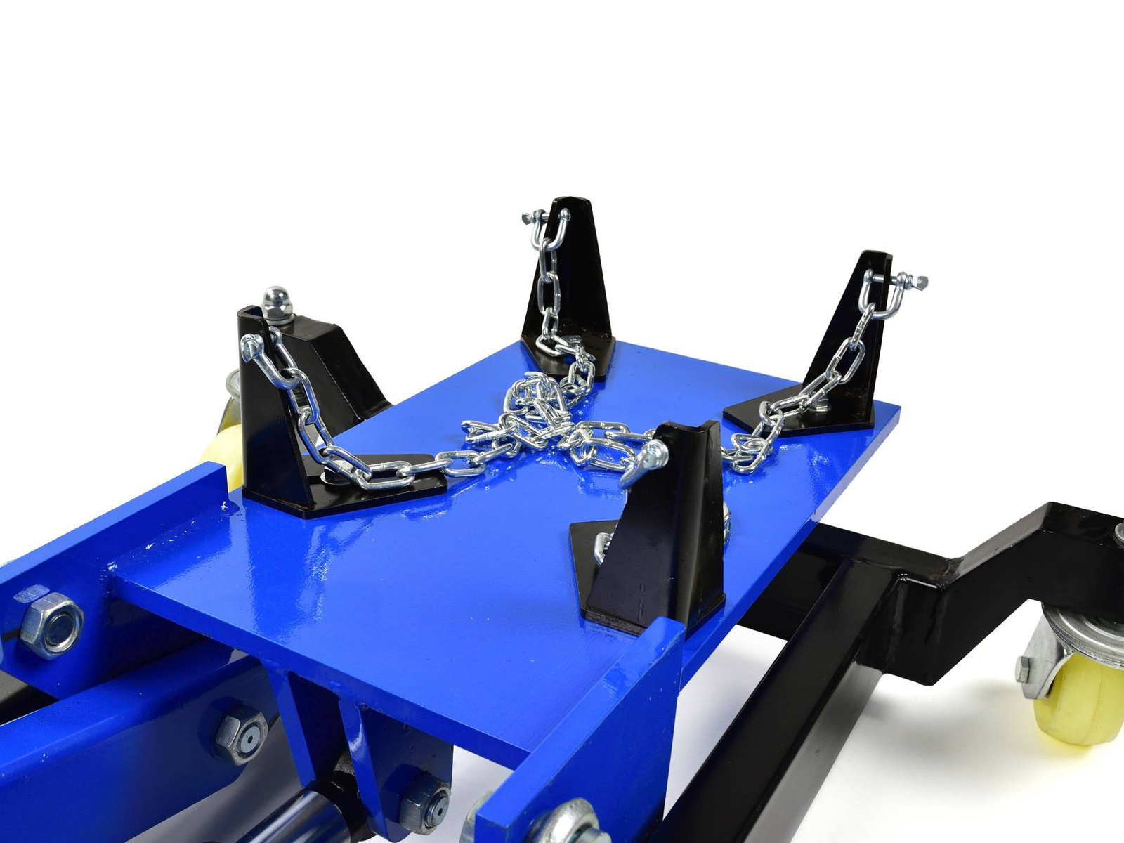 Hydrauliczny podnośnik podłogowy przeznaczony do wspomagania montażu oraz demontażu skrzyni biegów, przekładni różnicowych itp. Solidna stalowa konstrukcja w połączeniu z szybkim podnośnikiem hydraulicznym o udźwigu do 3 ton sprosta oczekiwaniom nawet najbardziej wymagających użytkowników. Posiada dwie śruby rzymskie przeznaczone do regulacji kąta nachylenia podstawy montażowej. Łatwe manewrowanie podnośnikiem umożliwia zestaw czterech łożyskowanych kół skrętnych wykonanych z poliamidu . W zestawie nie zabrakło również czterech niezależnie regulowanych uchwytów oraz dwóch łańcuchów przeznaczonych do mocowania demontowanego elementu.