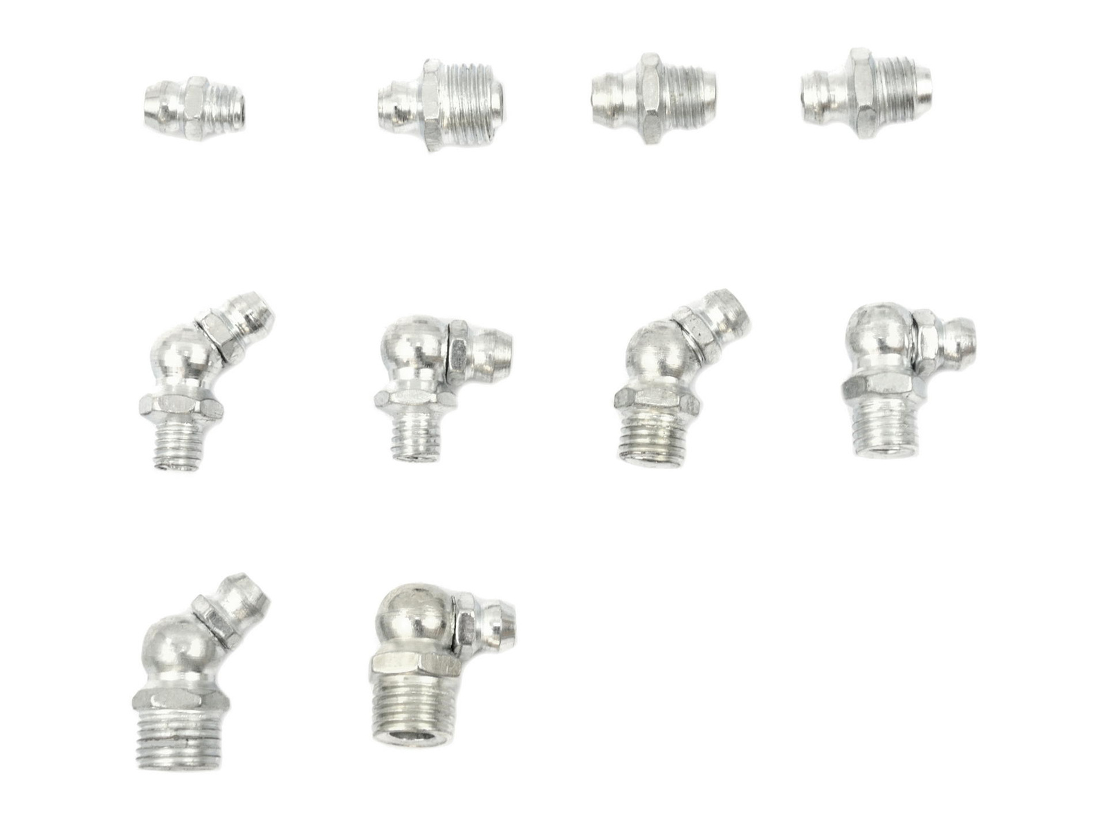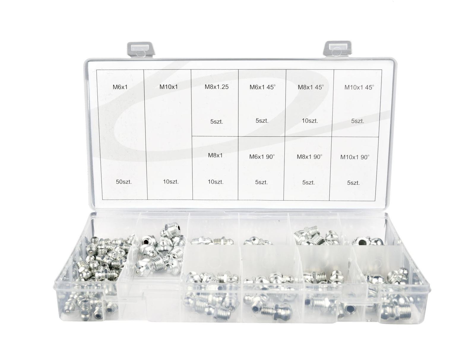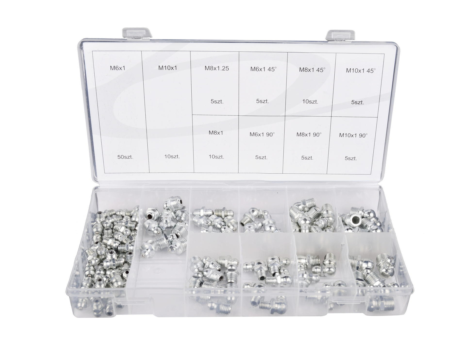 110 - elementowy zestaw stalowych kalamitek. Idealne do stosowania z ręcznymi i hydraulicznymi smarownicami / towotnicami. Charakterystyka produktu kalamitki w rozmiarach M6 - M10: proste, 45° oraz 90° 110 sztuk w zestawie pojemnik z tworzywa sztucznego z praktycznymi przegródkami Zawartość zestawu 50 sztuk - M6 x 1,00 10 sztuk - M8 x 1,00 5 sztuk - M8 x 1,25 10 sztuk - M10 x 1,00 5 sztuk - M6 x 1,00 45° 10 sztuk - M8 x 1,00 45° 5 sztuk - M10 x 1,00 45° 5 sztuk - M6 x 1,00 90° 5 sztuk - M8 x 1,00 90° 5 sztuk - M10 x 1,00 90°