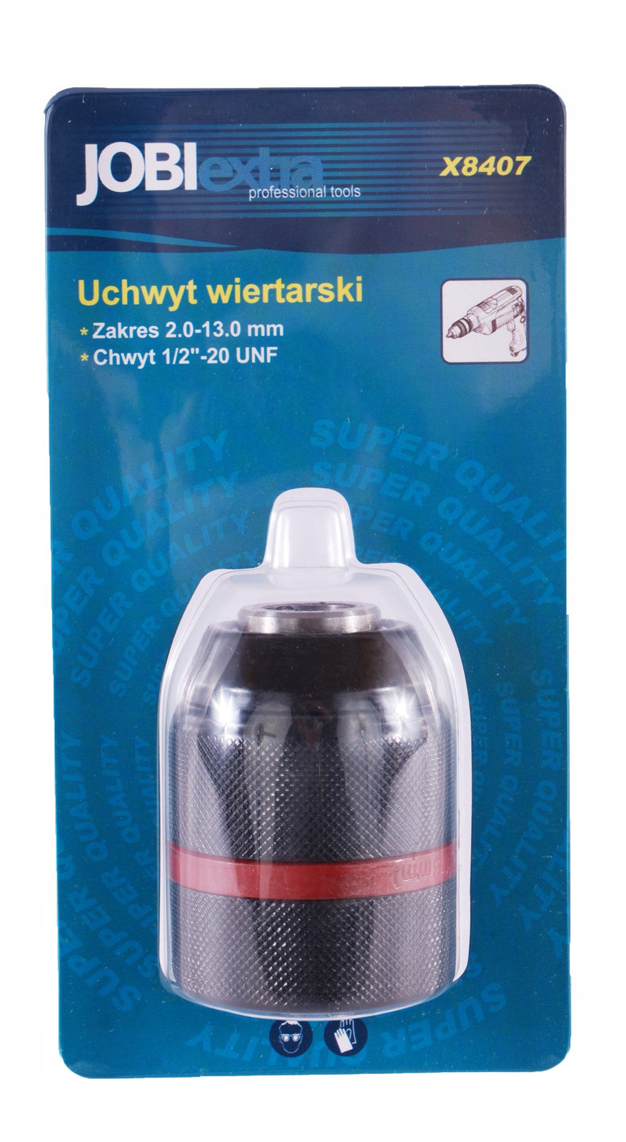 Uchwyt wiertarski Jobiextra samozaciskowy, posiadający gwint wewnętrzny o rozmiarze 1/2". Pozwala na bezkluczykowe mocowanie wierteł z uchwytem cylindrycznym o średnicach od 2 do 13 mm. Nadaje się do montowania w wiertarkach sieciowych małej mocy, wkrętarkach akumulatorowych i wiertarkach pneumatycznych.