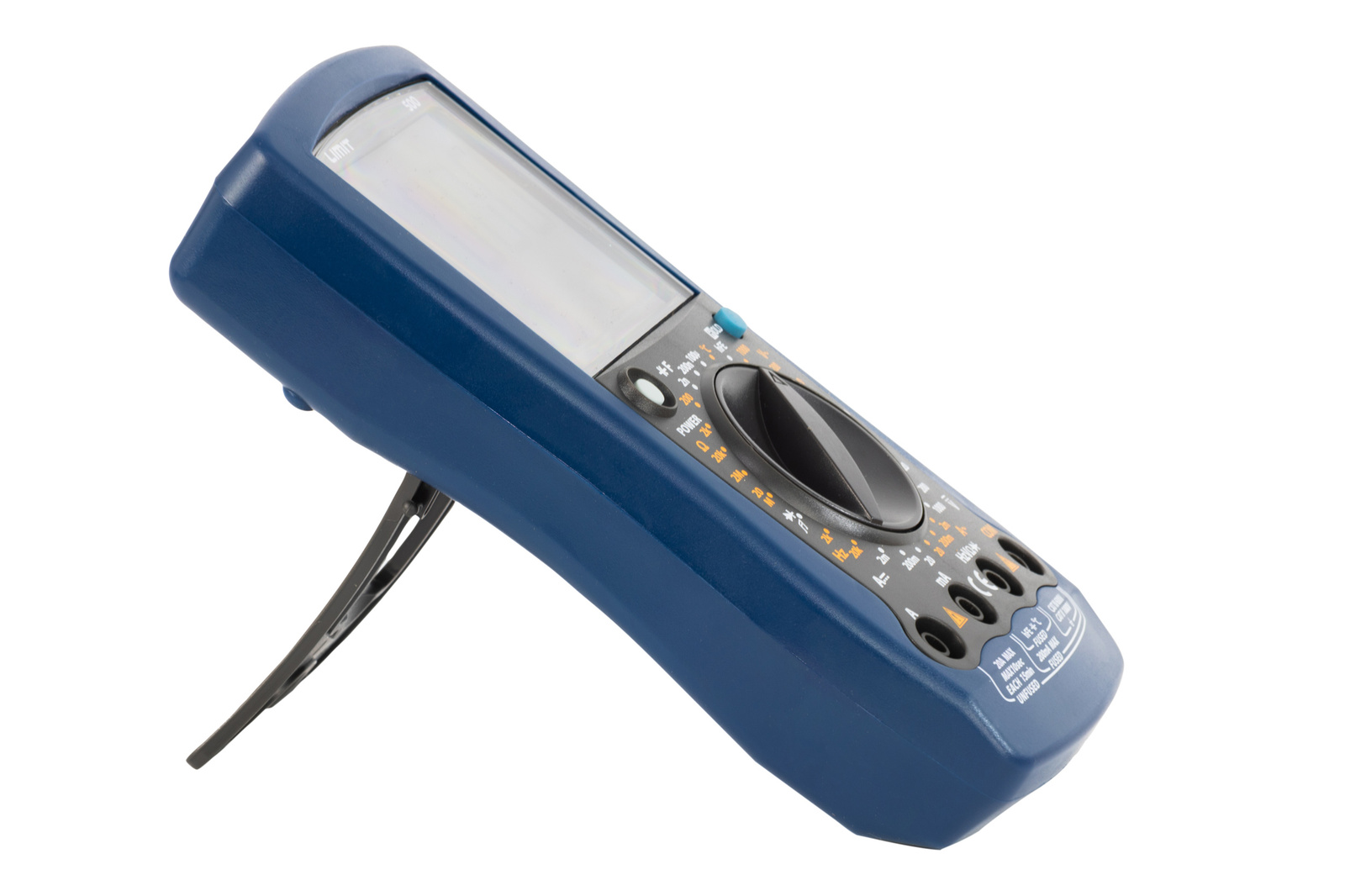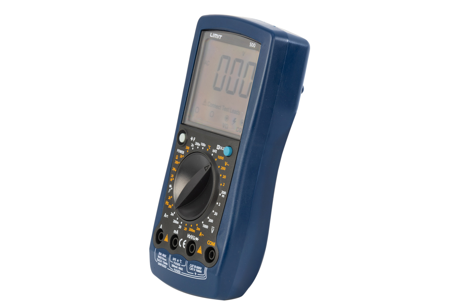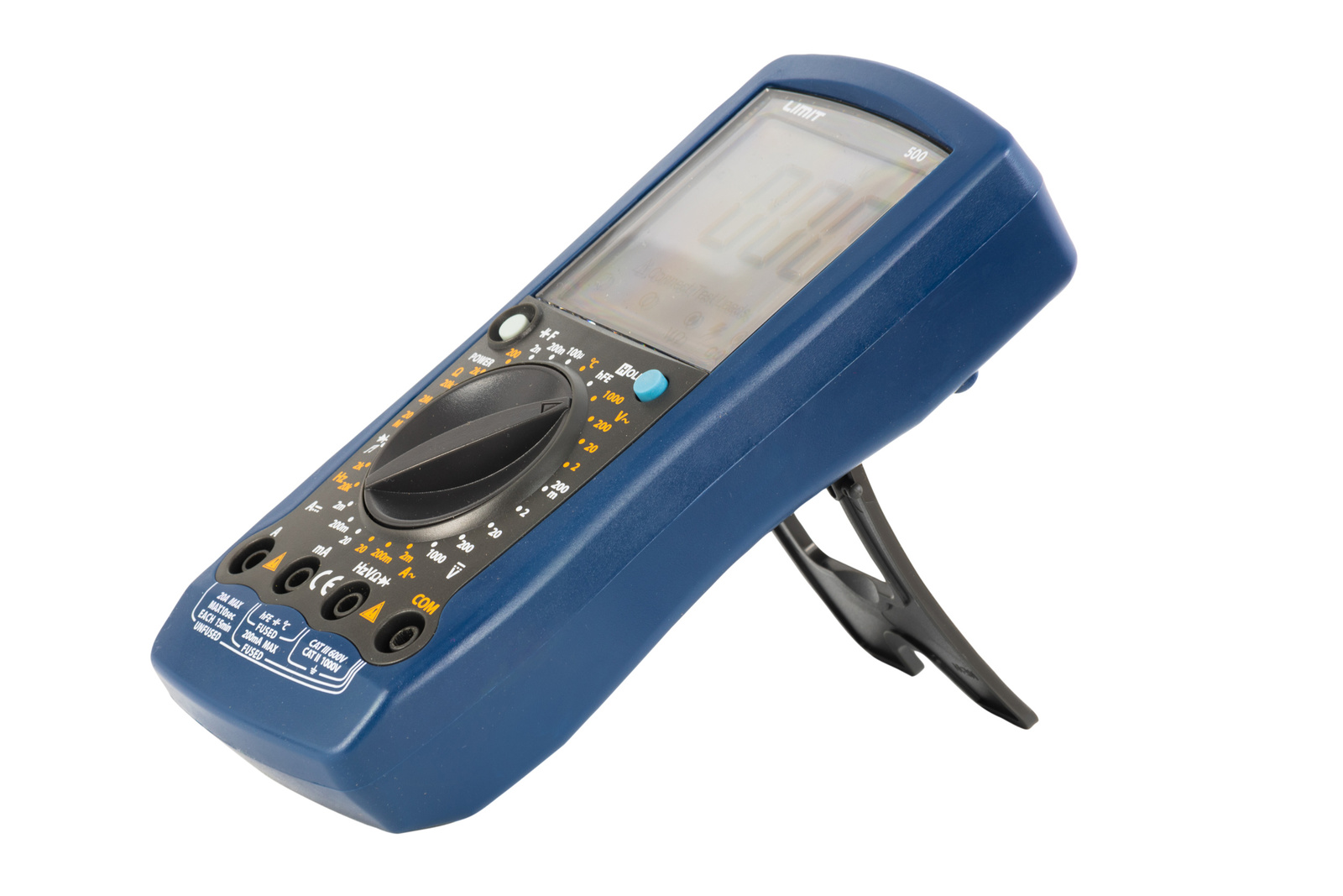 Multimetr cyfrowy o dużym wyświetlaczu, wskazującym poprawność dołączenia kabelków oraz wybrany zakres. Do mierzenia napięcia stałego/zmiennego, prądu stałego/zmiennego, rezystancji, pojemności, częstotliwości, temperatury. Ponadto posiada następujące funkcje: test diodowy, test tranzystorów, test ciągłości obwodu z sygnalizacją akustyczną, pamięć wyniku pomiaru "datahold", sygnalizacja niskiego stanu baterii. Automatyczne wyłączanie.Dostarczany w komplecie z kabelkami pomiarowymi, złączem uniwersalnym, przetwornikiem temperatury typu K do maks. 260°C, baterią i instrukcją obsługi. Osłona gumowa i odkładana podpórka.Długość podziałki 1999. Izolacja CAT II 1000V / CAT III 600 V wg IEC 61010. Zabezpieczenie zakresów do maks. 200mA.