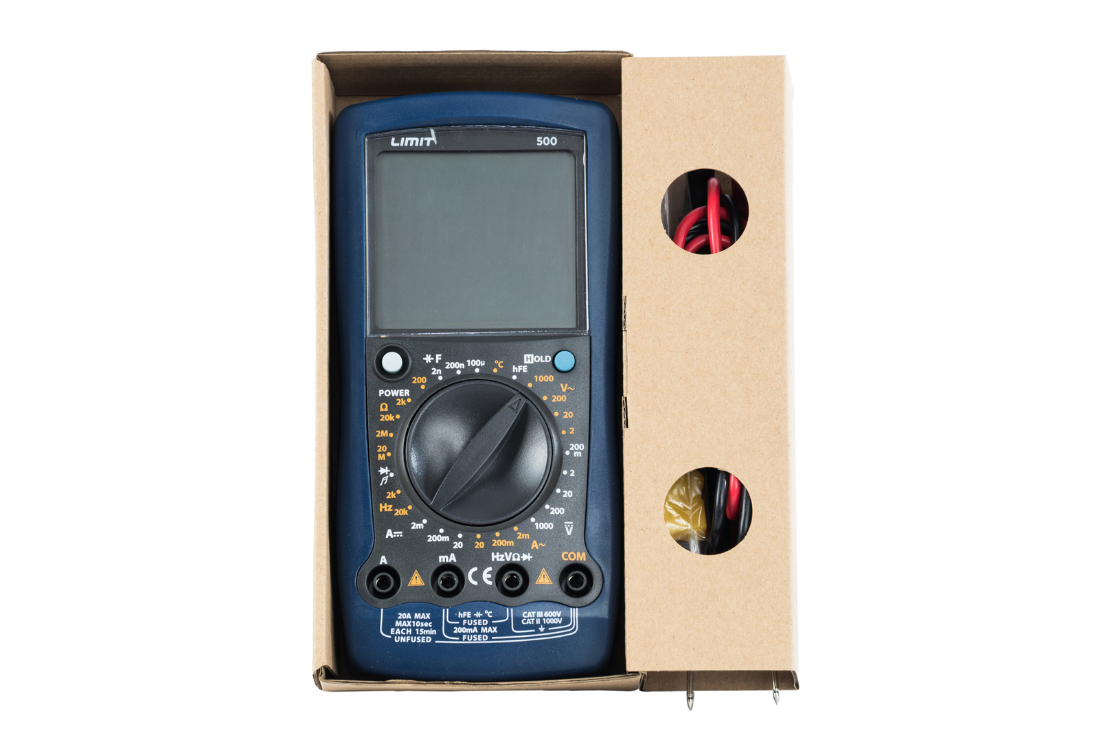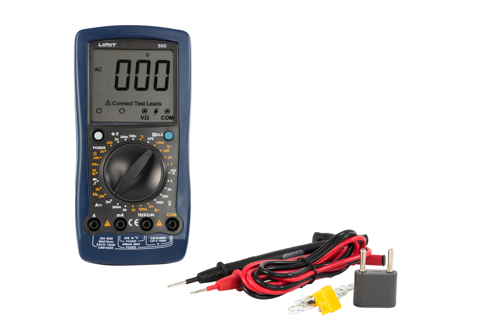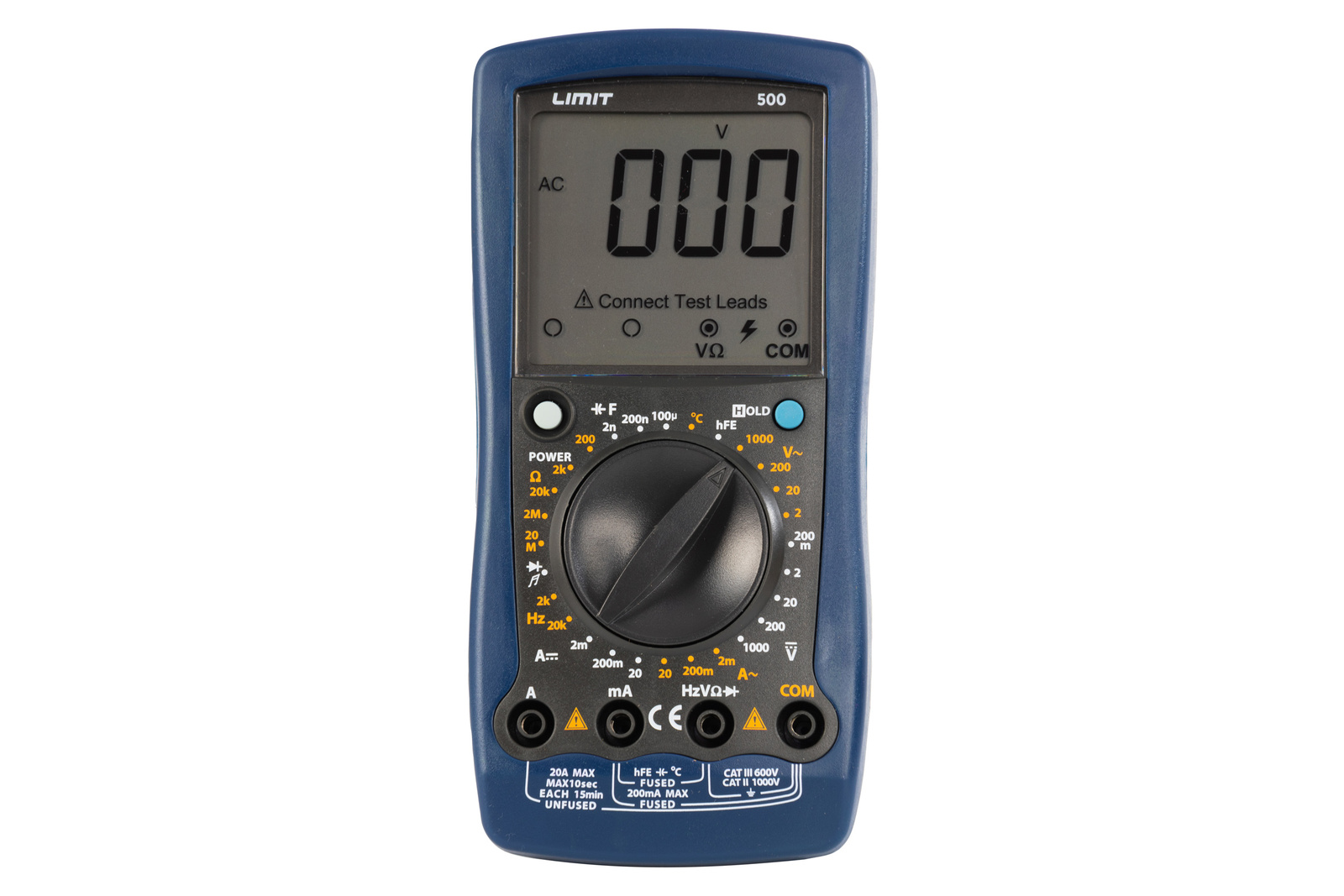 Multimetr cyfrowy o dużym wyświetlaczu, wskazującym poprawność dołączenia kabelków oraz wybrany zakres. Do mierzenia napięcia stałego/zmiennego, prądu stałego/zmiennego, rezystancji, pojemności, częstotliwości, temperatury. Ponadto posiada następujące funkcje: test diodowy, test tranzystorów, test ciągłości obwodu z sygnalizacją akustyczną, pamięć wyniku pomiaru "datahold", sygnalizacja niskiego stanu baterii. Automatyczne wyłączanie.Dostarczany w komplecie z kabelkami pomiarowymi, złączem uniwersalnym, przetwornikiem temperatury typu K do maks. 260°C, baterią i instrukcją obsługi. Osłona gumowa i odkładana podpórka.Długość podziałki 1999. Izolacja CAT II 1000V / CAT III 600 V wg IEC 61010. Zabezpieczenie zakresów do maks. 200mA.