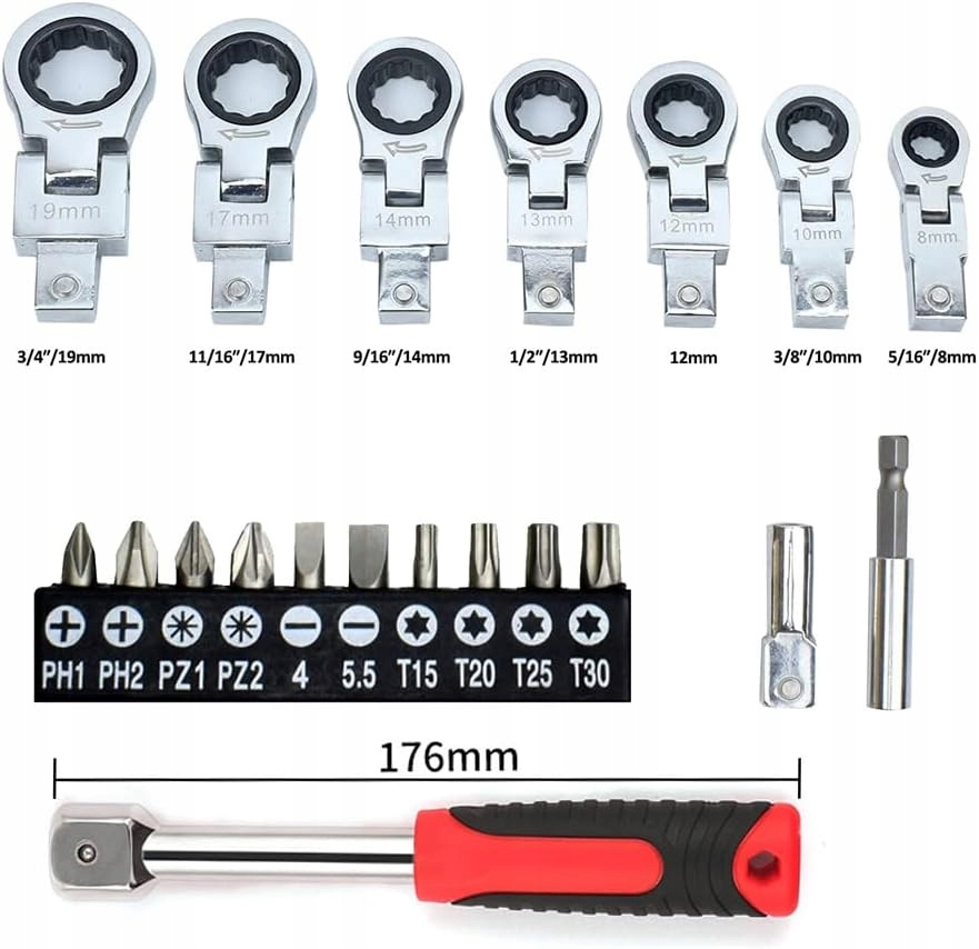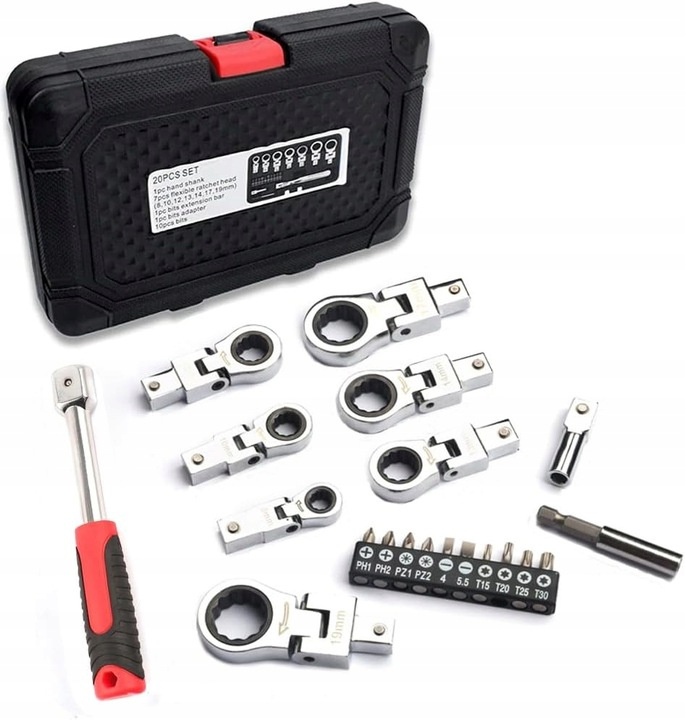 - Wymienne głowice kluczy 8/10/12/13/14/17/19mm (łącznie 7 szt.)