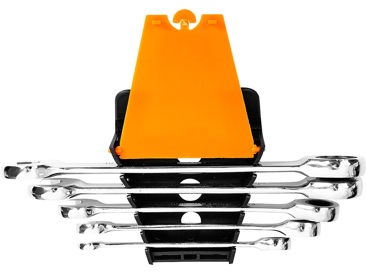 Zestaw 5 szt. kluczy płasko-oczkowych z grzechotką w rozmiarach 8-19 mm.