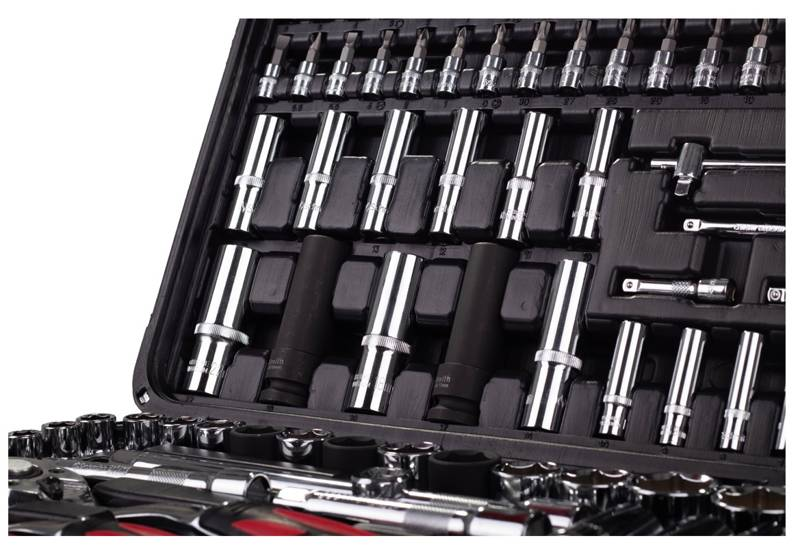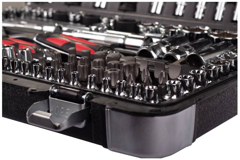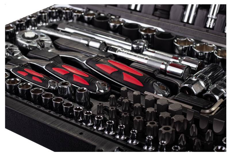 Zestaw kluczy nasadowych w walizce 150 części wykonanych ze stopu stali CR-V wytrzymałej na naprężenia statyczne i kinetyczne. Unikalna powłoka na powierzchni znacząco zwiększa komfort pracy oraz pozwala na utrzymanie narzędzi w czystości. Praktyczna i solidna walizka z tworzywa sztucznego z metalowymi zatrzaskami i poręcznym uchwytem.