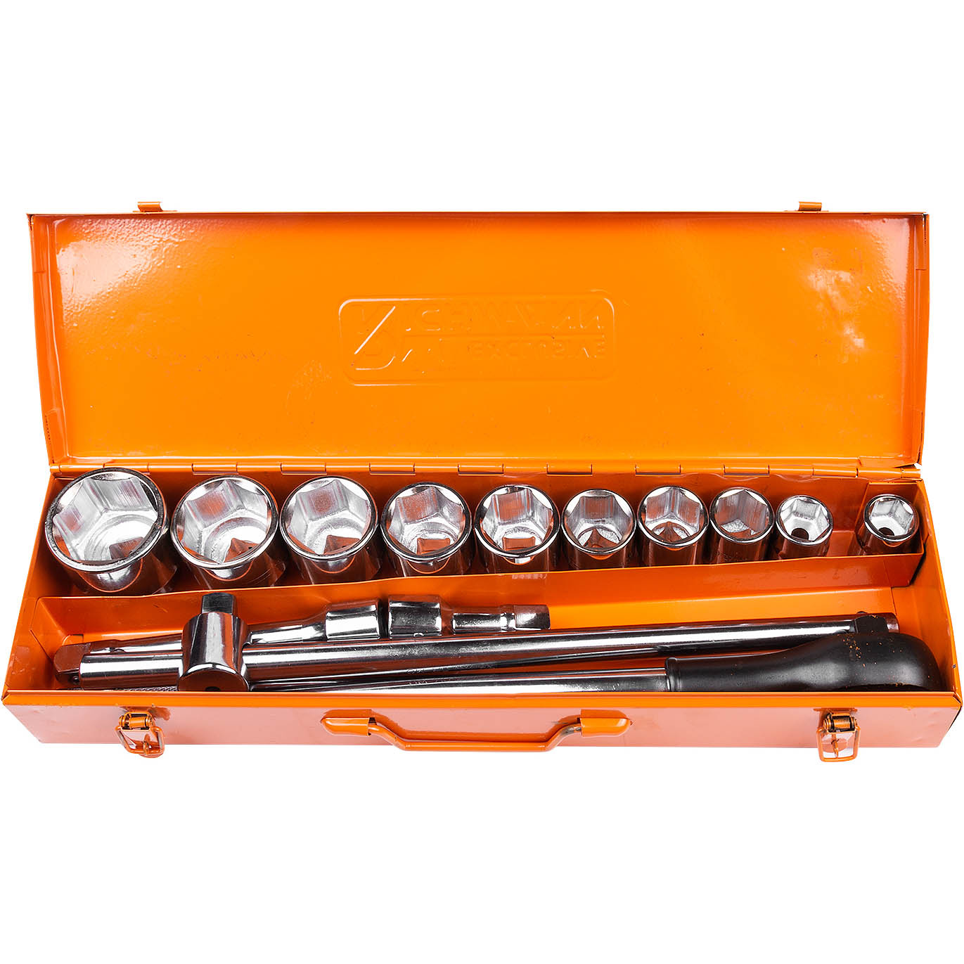 Zestaw kluczy nasadowych 6-kątnych z grzechotką 3/4" w zakresie rozmiarów 22-50 mm.