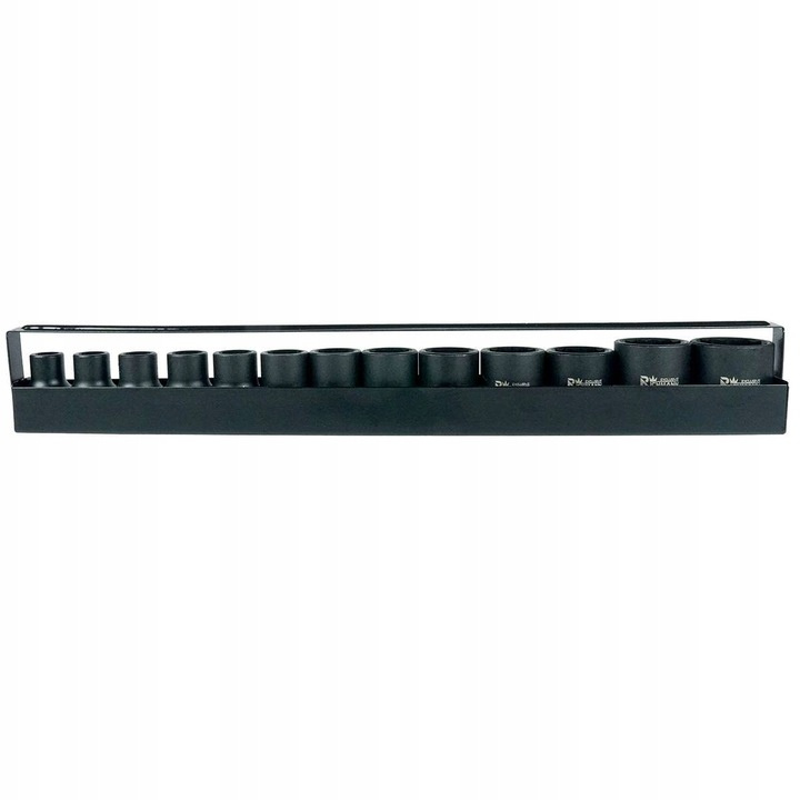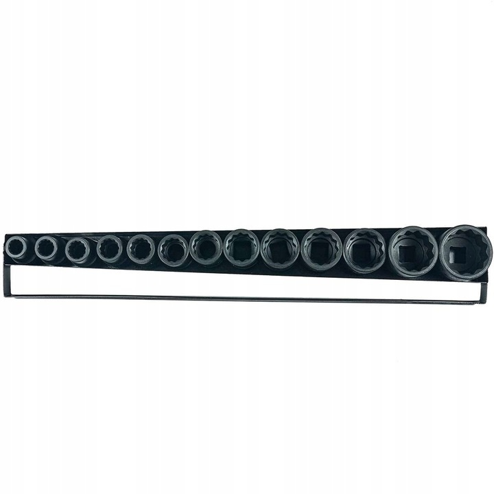 Zestaw 13 sztuk nasadek udarowych dwunastokątnych ½” w zakresie rozmiarów 10 - 30 mm umieszczonych w metalowym opakowaniu zbiorczym z uchwytem.