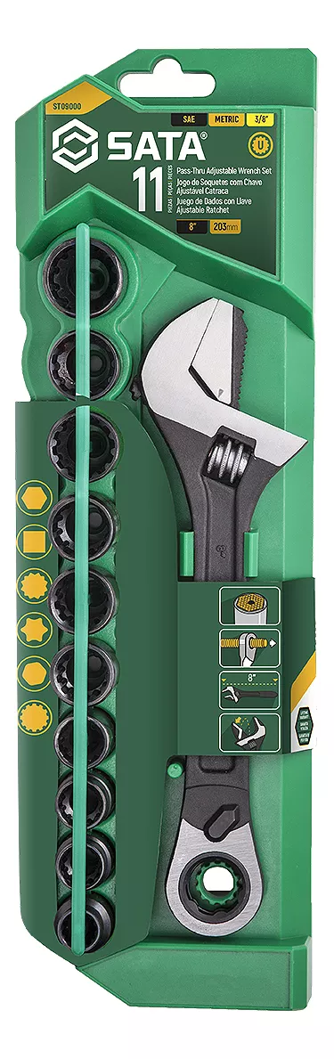 Sercem zestawu jest 8-calowy klucz nastawny z funkcją klucza do rur oraz z grzechotkowym kluczem oczkowym PASS-THRU. Oprócz niego, w skład kompletu SATA ST09000 wchodzi 10 nasadek przelotowych (PASS-THRU), metryczno-calowych o rozmiarach: 10 mm (3/8”), 11 mm (7/16”), 12 mm (15/32”), 13 mm (1/2”), 14 mm (9/16”), 15 mm (19/32”), 16 mm (5/8”), 17 mm (11/16”), 18 mm (23/32”) i 19 mm (3/4”). Narzędzia wchodzące w skład zestawu SATA ST09000 wykonano z wysokiej jakości stali. Ich powierzchnię oksydowano w celu zwiększenia jej odporności na korozję.