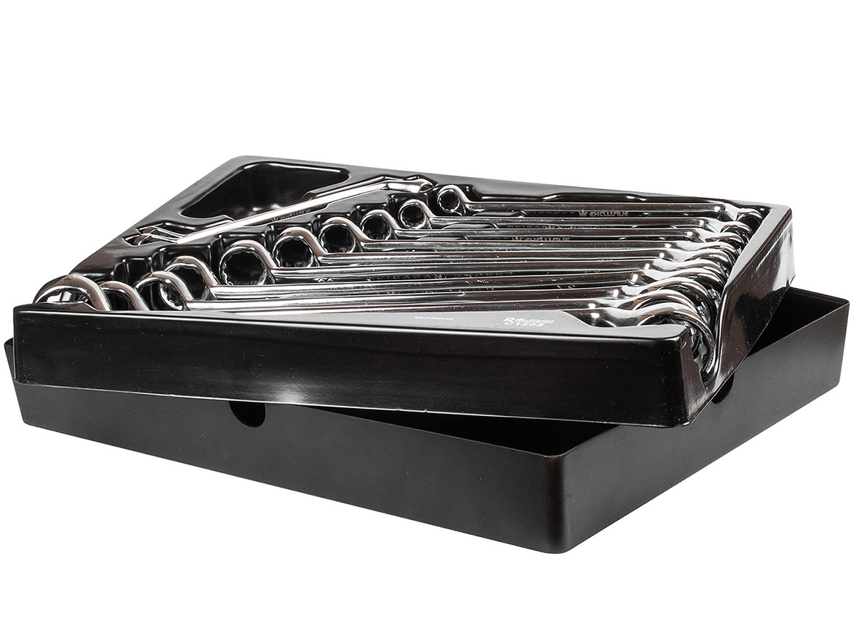 Zestaw 12 kluczy oczkowo-giętych umieszczonych we wkładzie do wózka warsztatowego typu A.