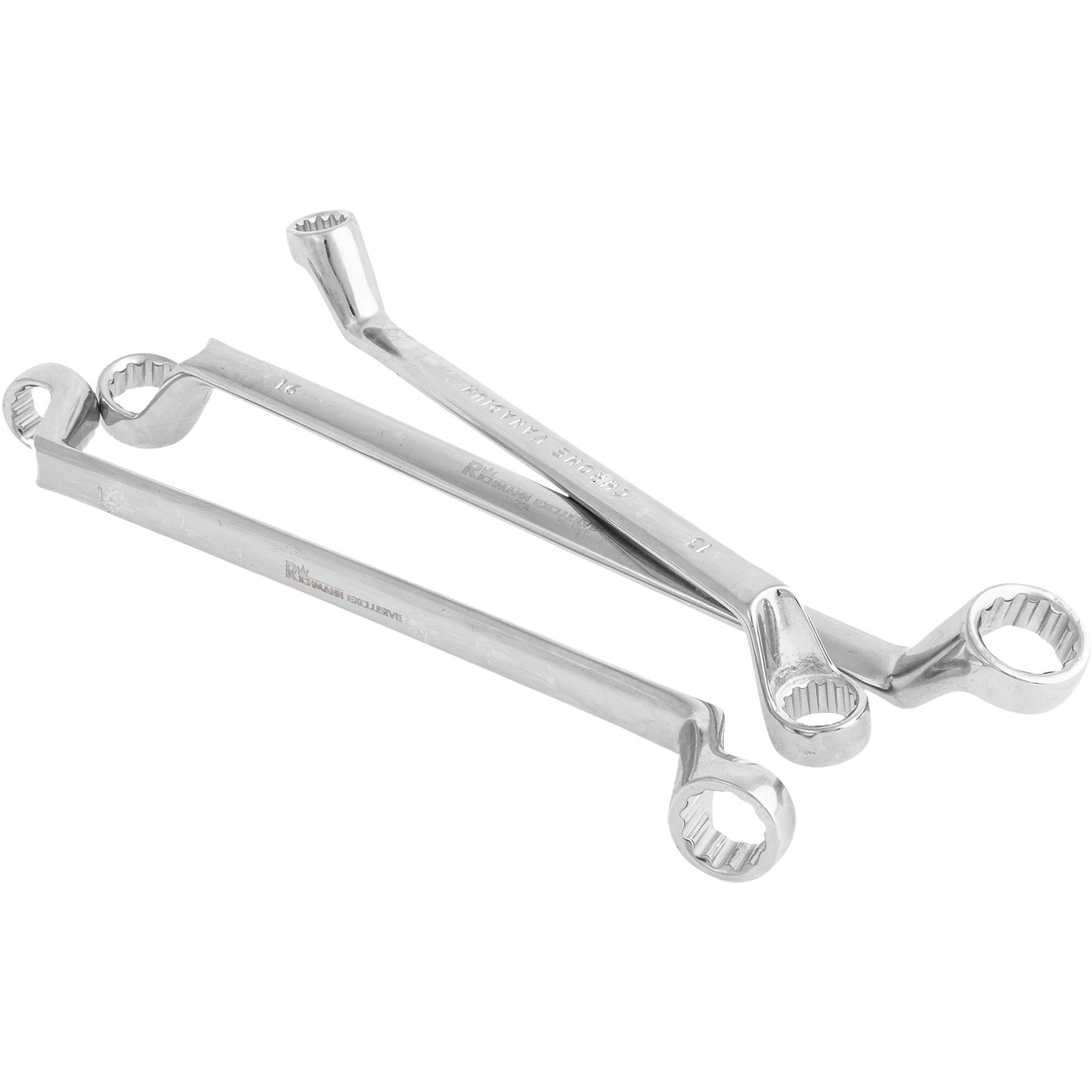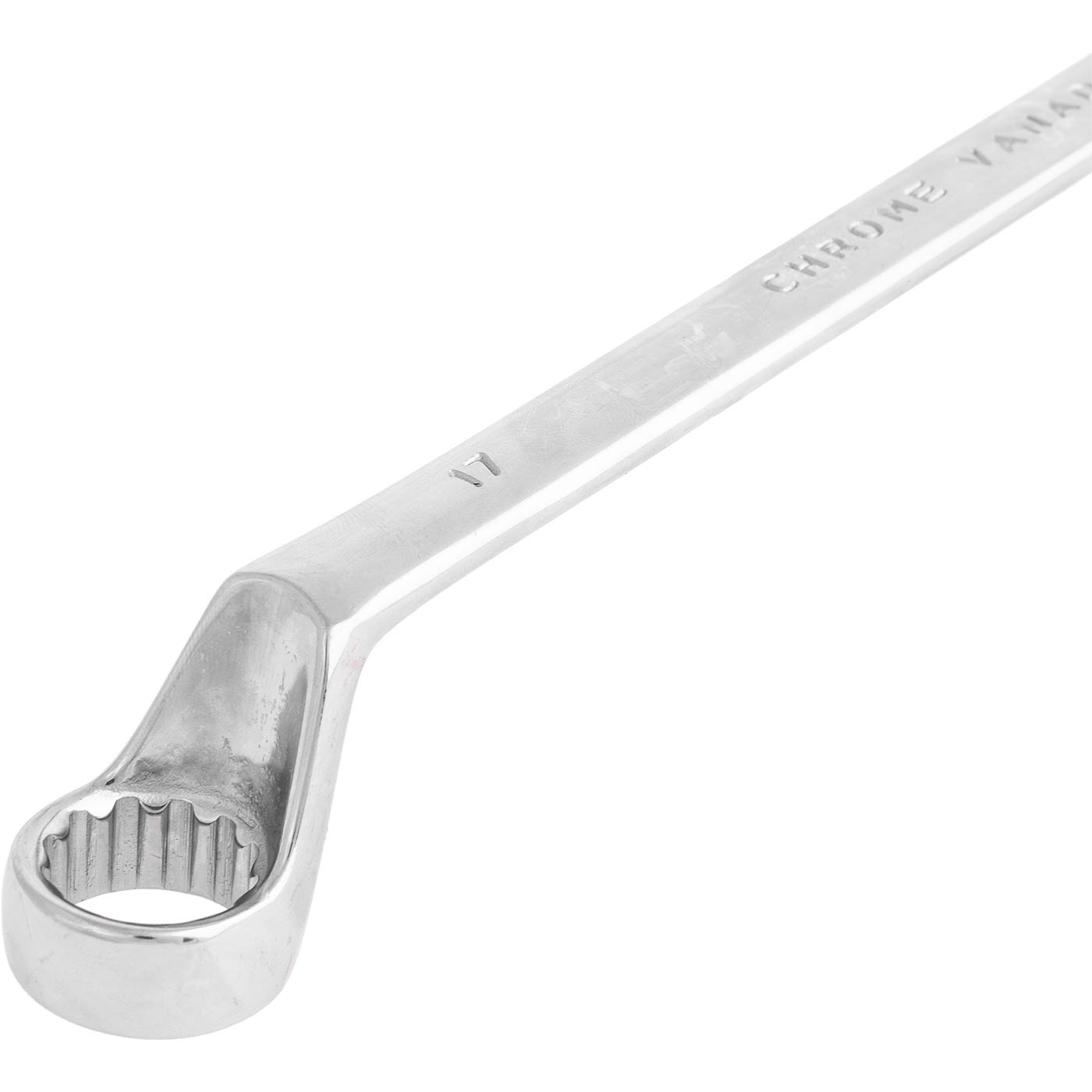 Dwustronny zestaw 6 szt. kluczy oczkowych giętych chromowanych w zakresie rozmiarów 6 - 17 mm.