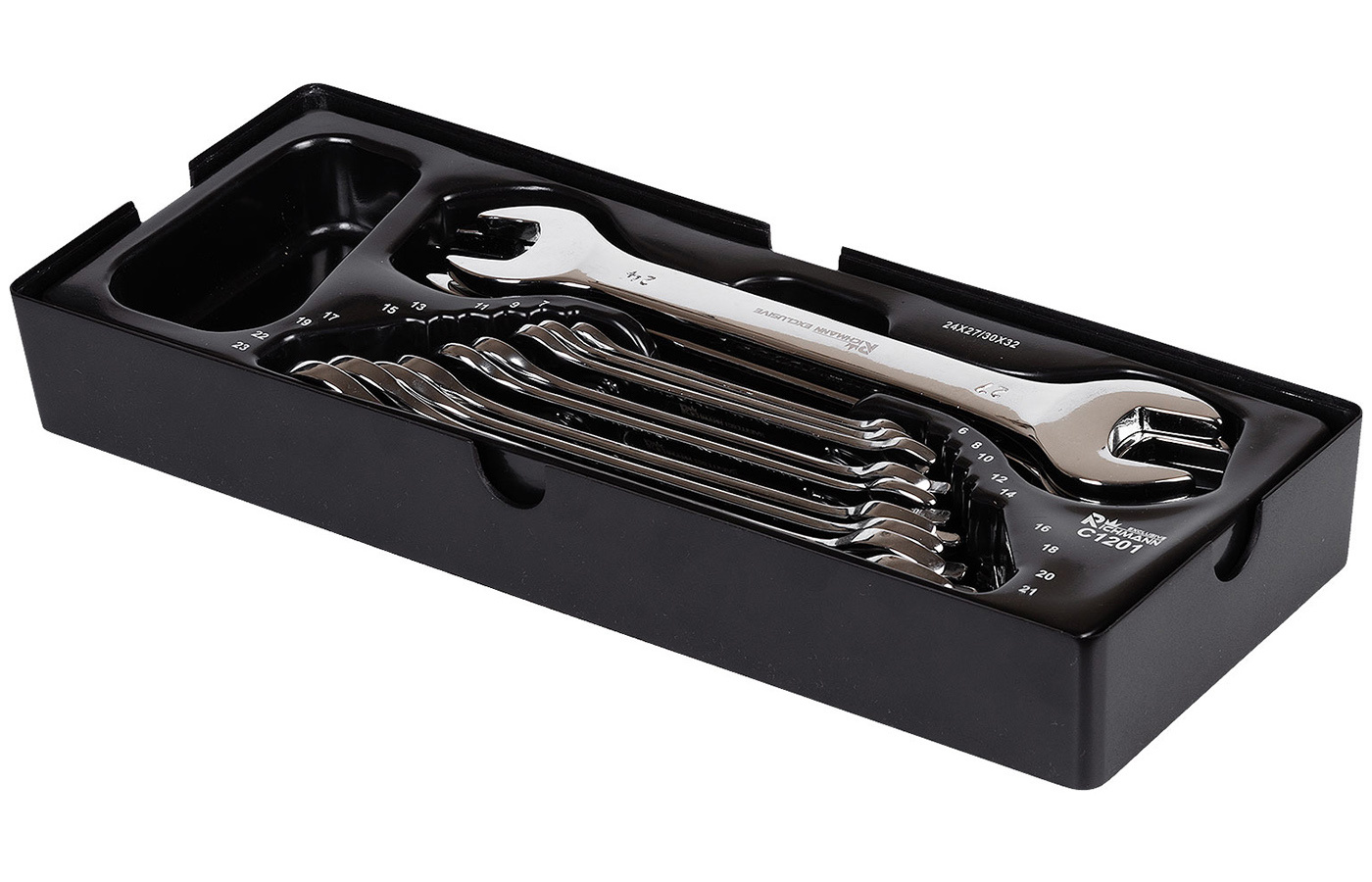 Zestaw 12 kluczy płaskich umieszczonych we wkładzie do wózka warsztatowego typu A.