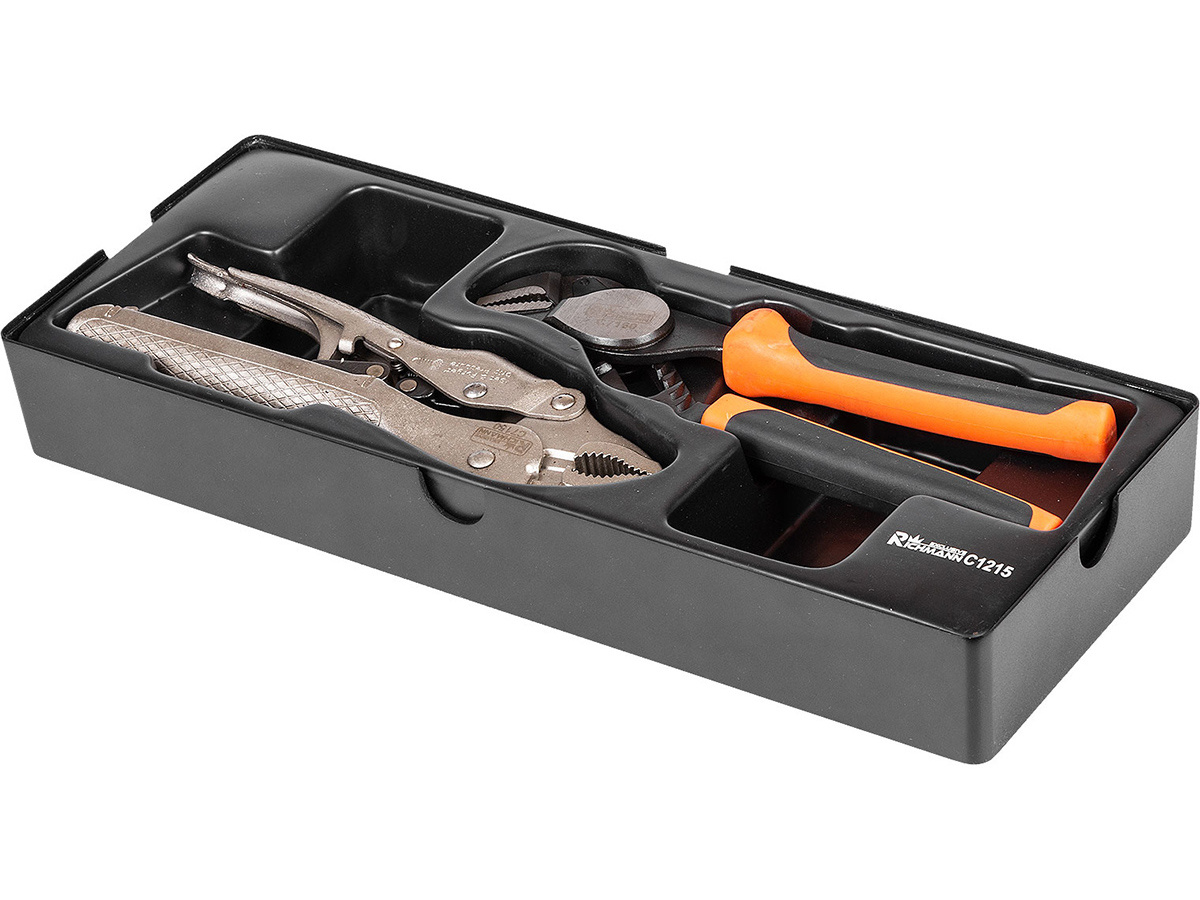 - szczypce zatrzaskowe i klucz do rur bezpiecznie rozmieszczone we wkładce narzędziowej;