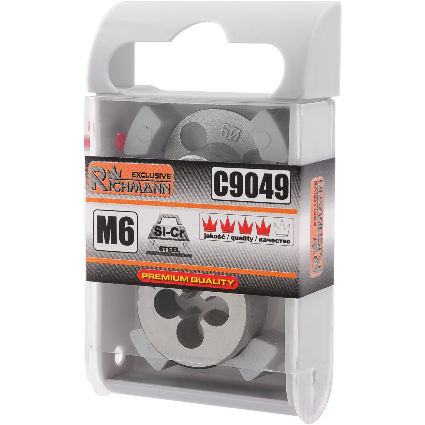 Narzynka z prowadnicą. Przeznaczona do nacinania gwintów zewnętrznych. Wykonana z wytrzymałej stali stopowej Si-Cr. W zestawie znajduje się prowadnica pomocna podczas obcinania gwintów zewnętrznych.