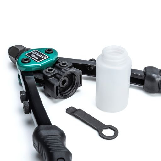 Nitownica wyposażona w plastikową butelkę do zbierania odpadów pozwala na łatwą utylizację zużytych nitów