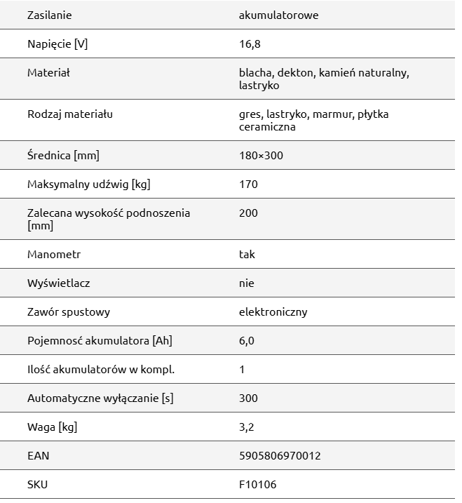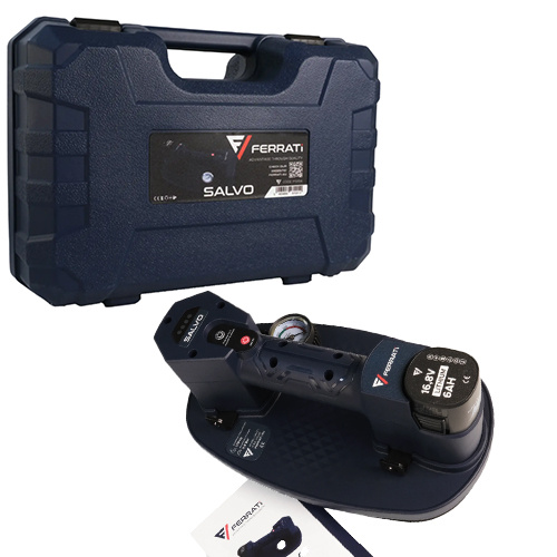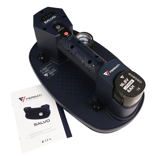 Przyssawka próżniowa automatyczna SALVO to w pełni automatyczny chwytak próżniowy o dużej sile udźwigu to najbardziej zaawansowane narzędzie wspomagające transportowanie. Wyposażony w zaawansowaną elektronikę automatycznie monitoruje podciśnienie i w przypadku jego utraty pompa próżniowa jest wywoływana do czasu przywrócenia wymaganej wartości. Znacznie zwiększa to wydajność akumulatora oraz zapewnia bezpieczeństwo w trakcie przenoszenia. Pomiar ciśnienia i wagi odbywa się w czasie rzeczywistym wpływając pozytywnie na czas reakcji. Efektywnie wyzwalana pompa o wysokiej wydajności przepływu powietrza sprawia, że czas operacyjny do uzyskania pełnej nośności chwytaka jest stosunkowo krótki. Wielowarstwowa uszczelka próżniowa z gumy piankowej jest mocna i odporna na utratę podciśnienia, mocno przylega do wymagających powierzchni. Przyssawka próżniowa automatyczna SALVO dostarczana jest w praktycznej walizce, aby chronić i bezpiecznie transportować produkt.