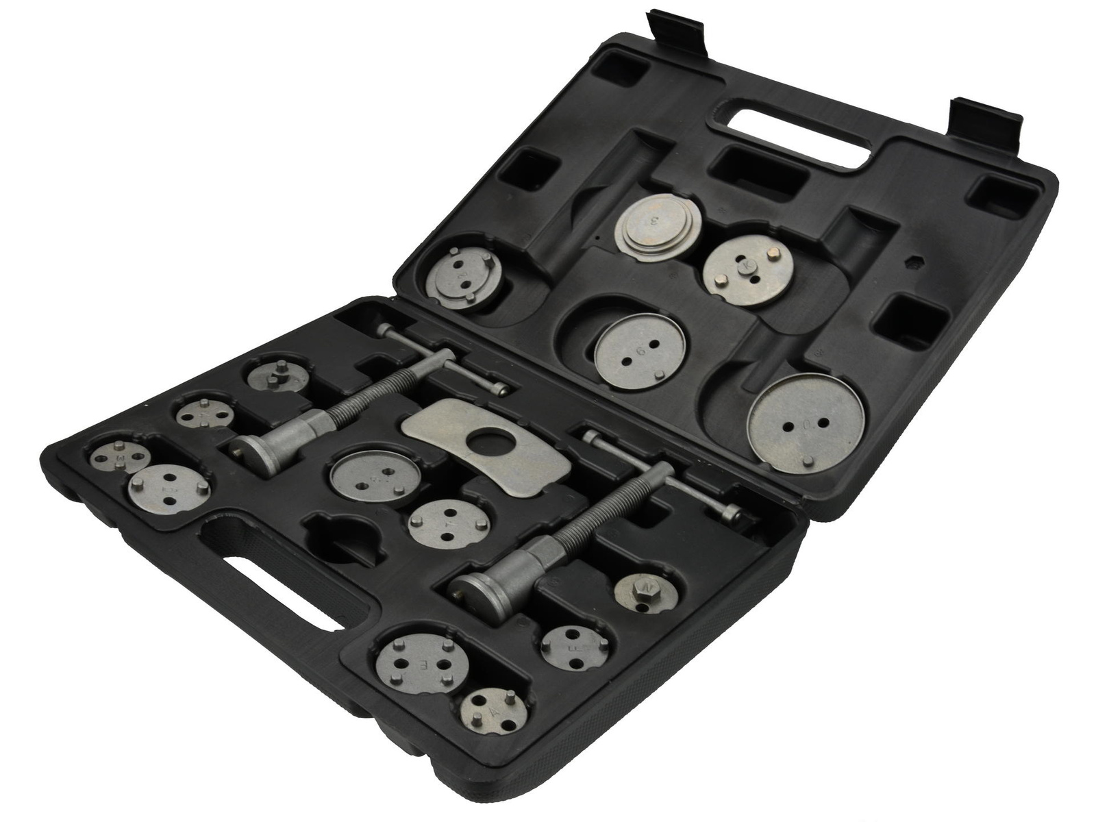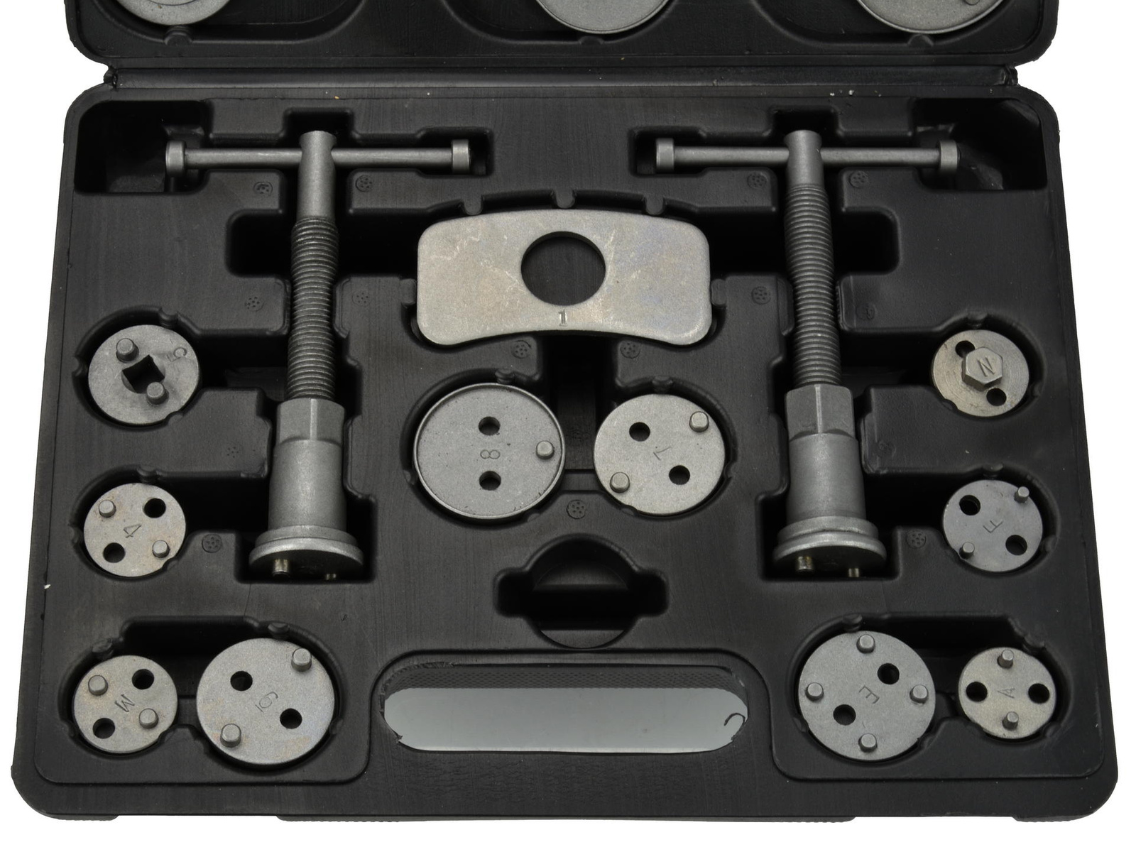 Profesjonalny 18-elementowy zestaw do cofania / wyciskania tłoczków hamulcowych, niezbędny przy naprawach pojazdów wyposażonych w hamulce tarczowe.