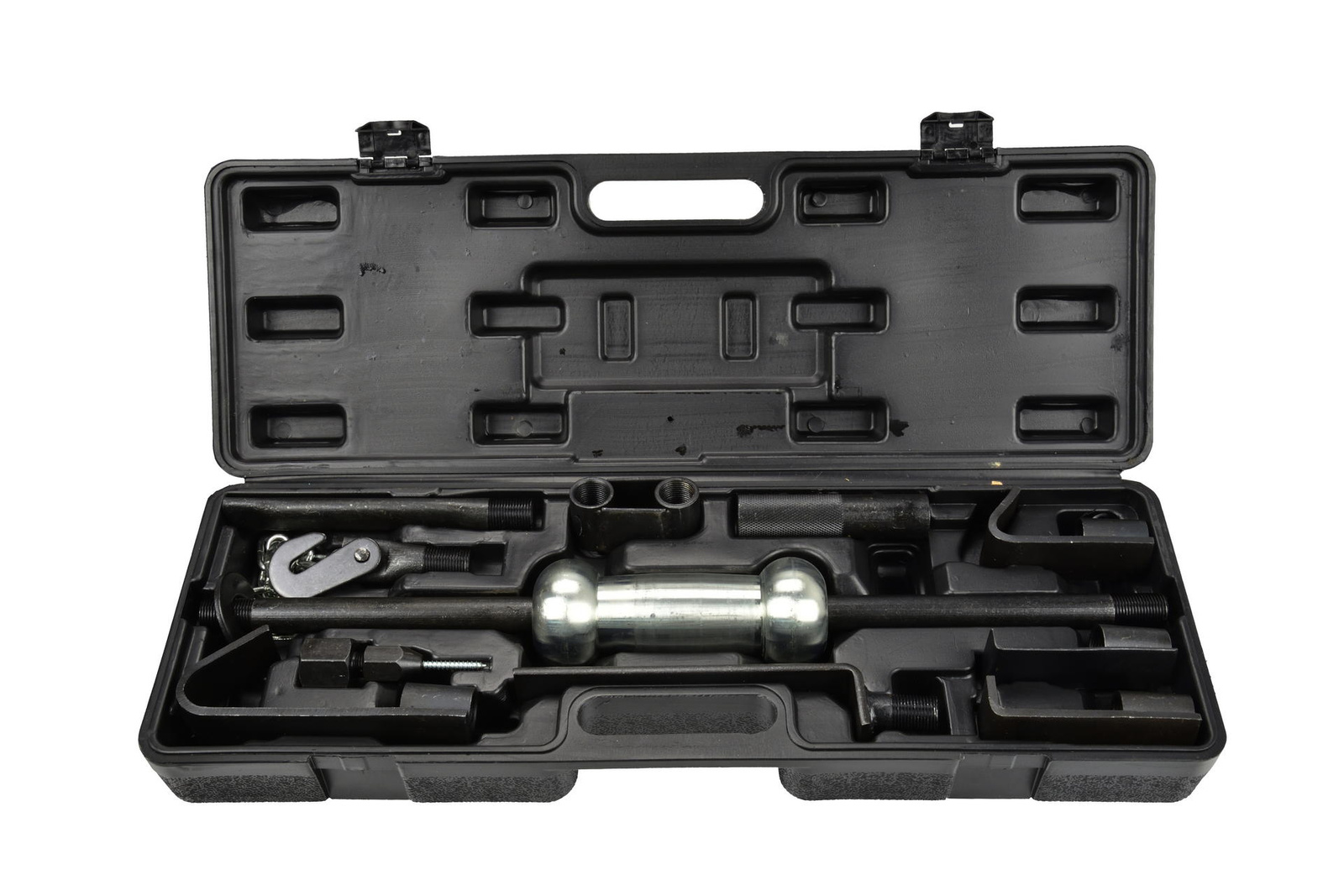 W zestawie znajdują się różnego rodzaju chwytaki, pobijaki, haczyki do wyciągania i usuwania wgnieceń. Idealny zestaw do naprawy karoserii, przydatny w każdym warsztacie.