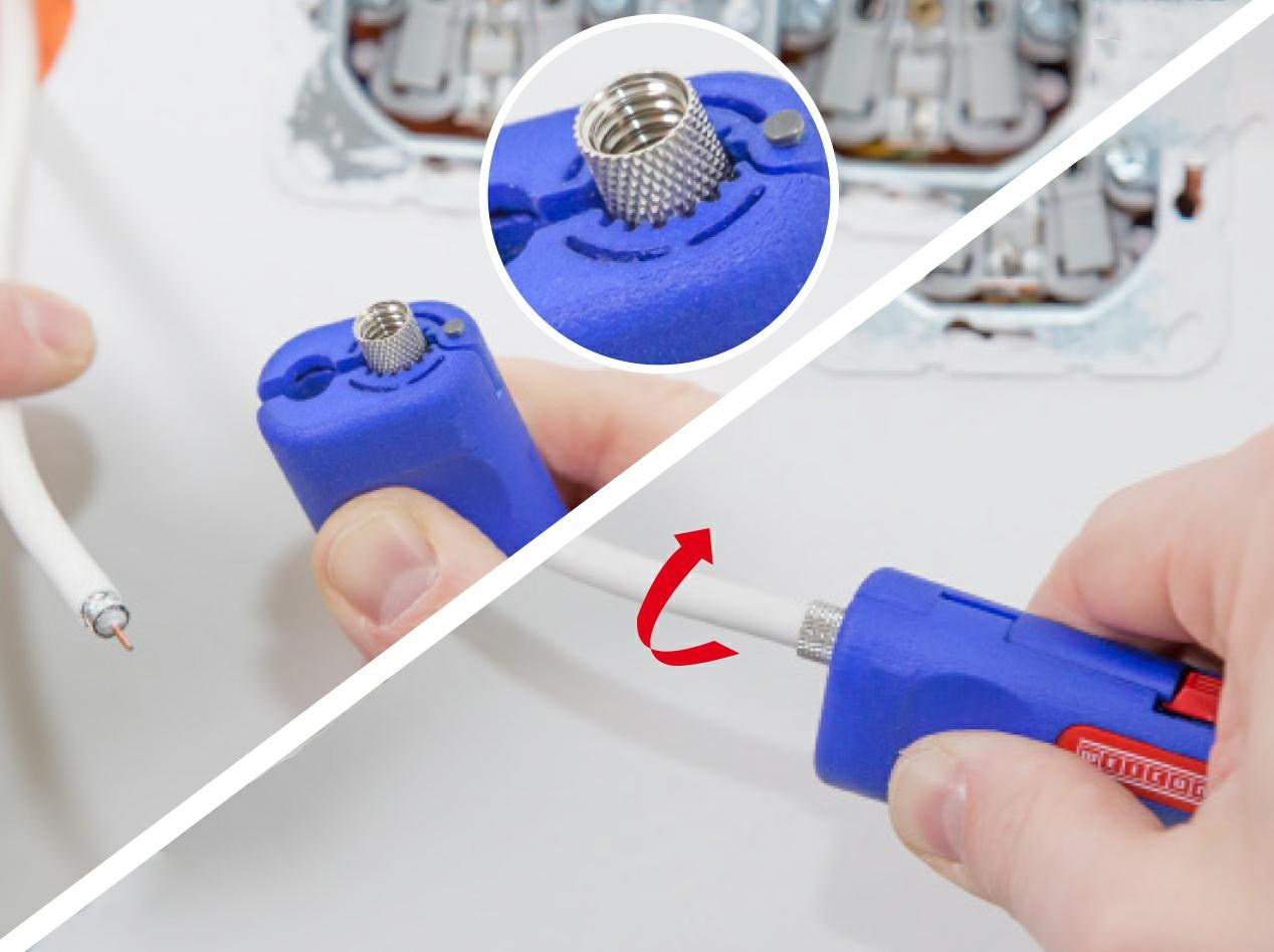 Poręczne narzędzie do montażu i demontażu złącza typu F ze zintegrowanym otwartym kluczem sześciokątnym SW 11 mm. Szczęki chwytające do nakręcania na kabel złącza typu F. Wymienne moduły w systemie ‚klik‘
